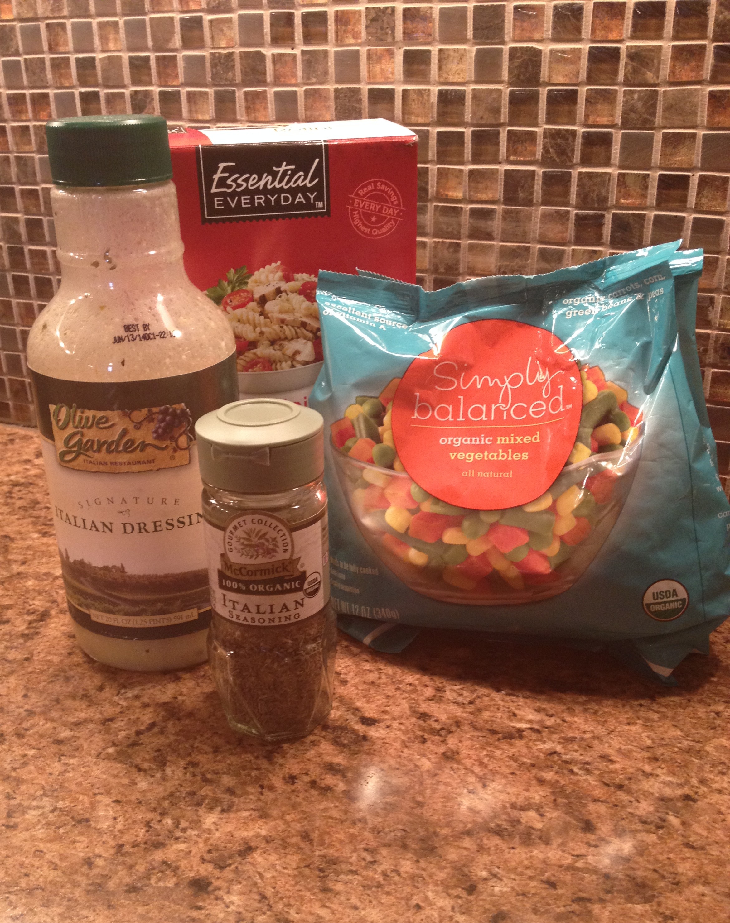 I haven’t been eating pasta or bread recently. I really don’t crave them anymore but I decided to make some pasta and warm up part of a jar of spaghetti sauce. I had leftover cooked pasta and uncooked pasta and started thinking about some things in my freezer and refrigerator that I wanted to use up. A while back I bought a bag of Simply Balanced organic mixed vegetables from Target and I had a bottle of Olive Garden’s Italian dressing that I was tired of seeing every time I opened the refrigerator. So, I thought I would cook the rest of the pasta, mix it all up, and see how it tasted. It was delicious and since it makes about seven cups, I have been eating it for a few days now. I actually stopped typing and walked into the kitchen to get some and am now eating it while posting this.