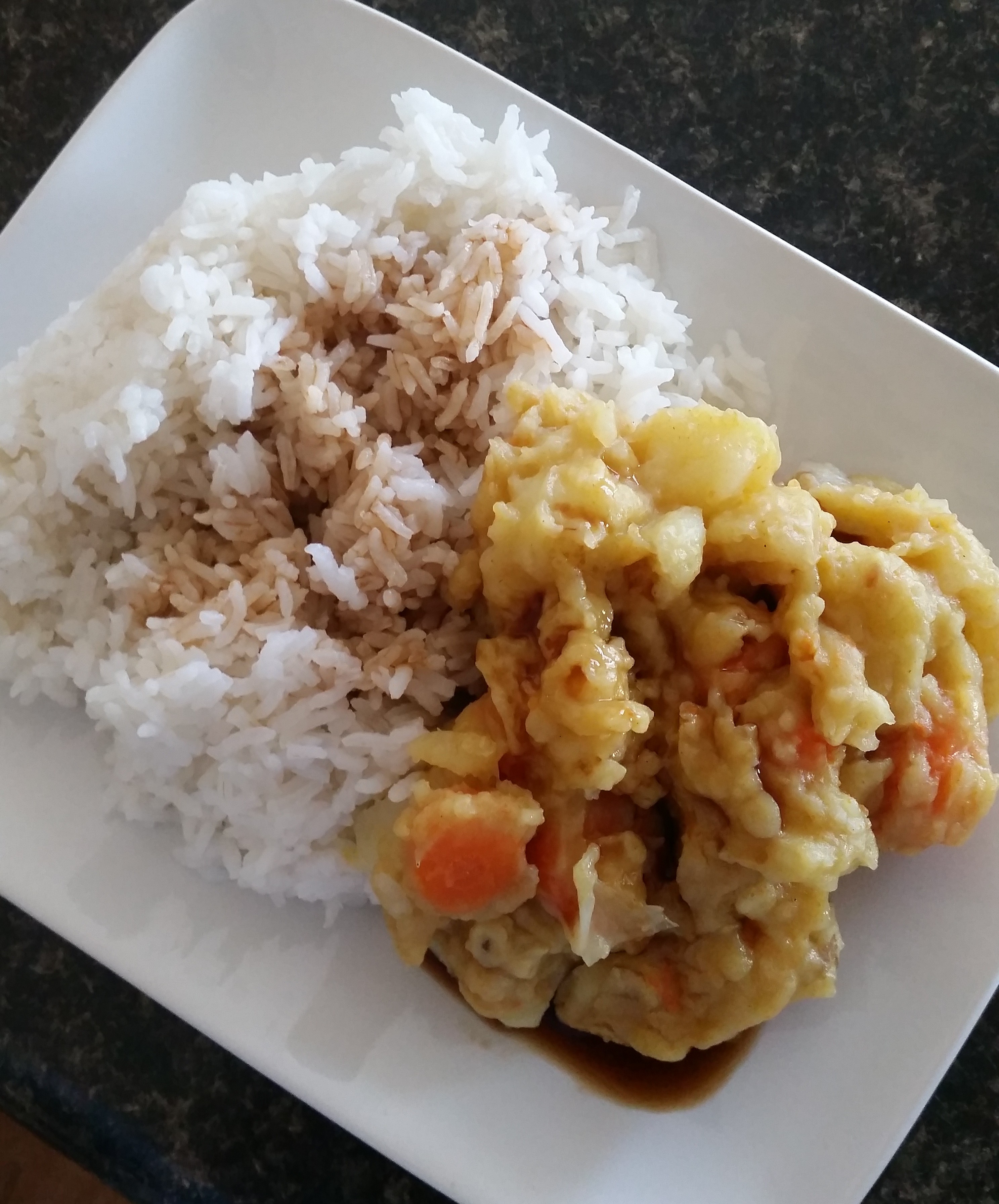 - Add curry powder and flour while lightly stirring (don’t stir too hard or you will make the potatoes mushy)
