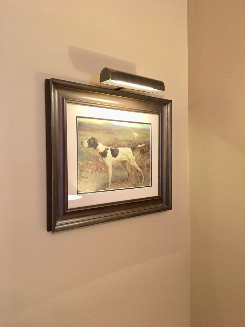 Picture lights that do not have a plug or are not designed to be installed in the wall are difficult to find. This one came from Amazon. This particular light’s cost changes a lot. Right now it is priced about $20 more than I paid. It comes with a remote and has multiple brightness settings.