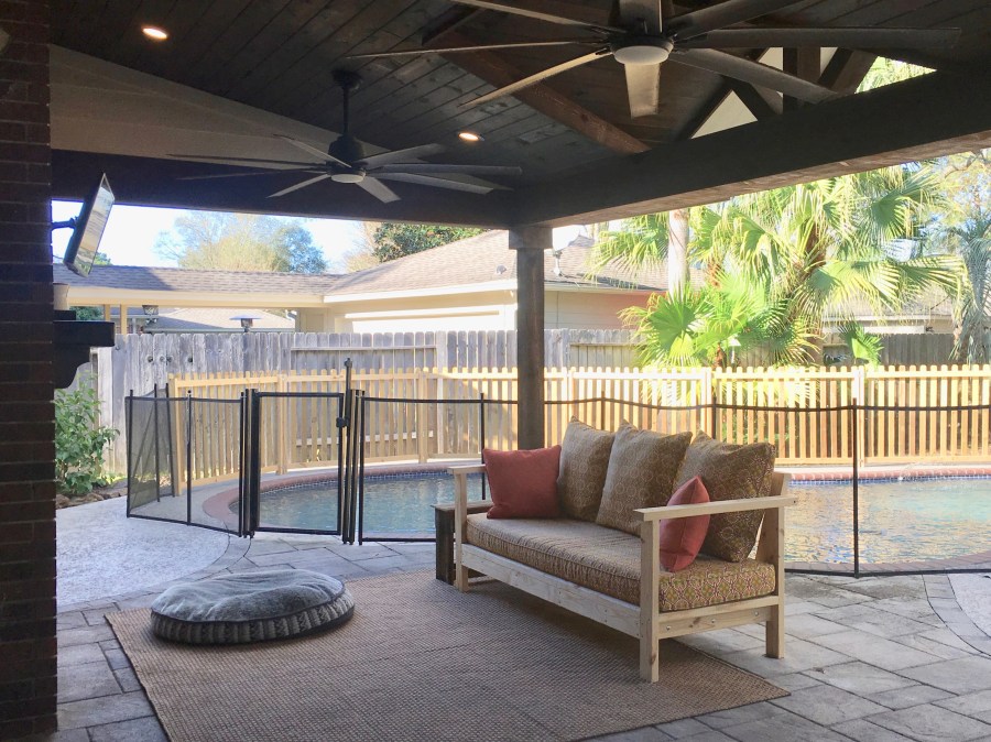 The portion of the yard with the pool was fenced in but that included the grassy areas so we needed to fence in just the pool not an entire portion of the yard. So my husband built a wooden fence to meet up with the mesh fence the former owners put up, only blocking off the pool (eventually, he will replace the mesh fencing with more wooden fencing).
