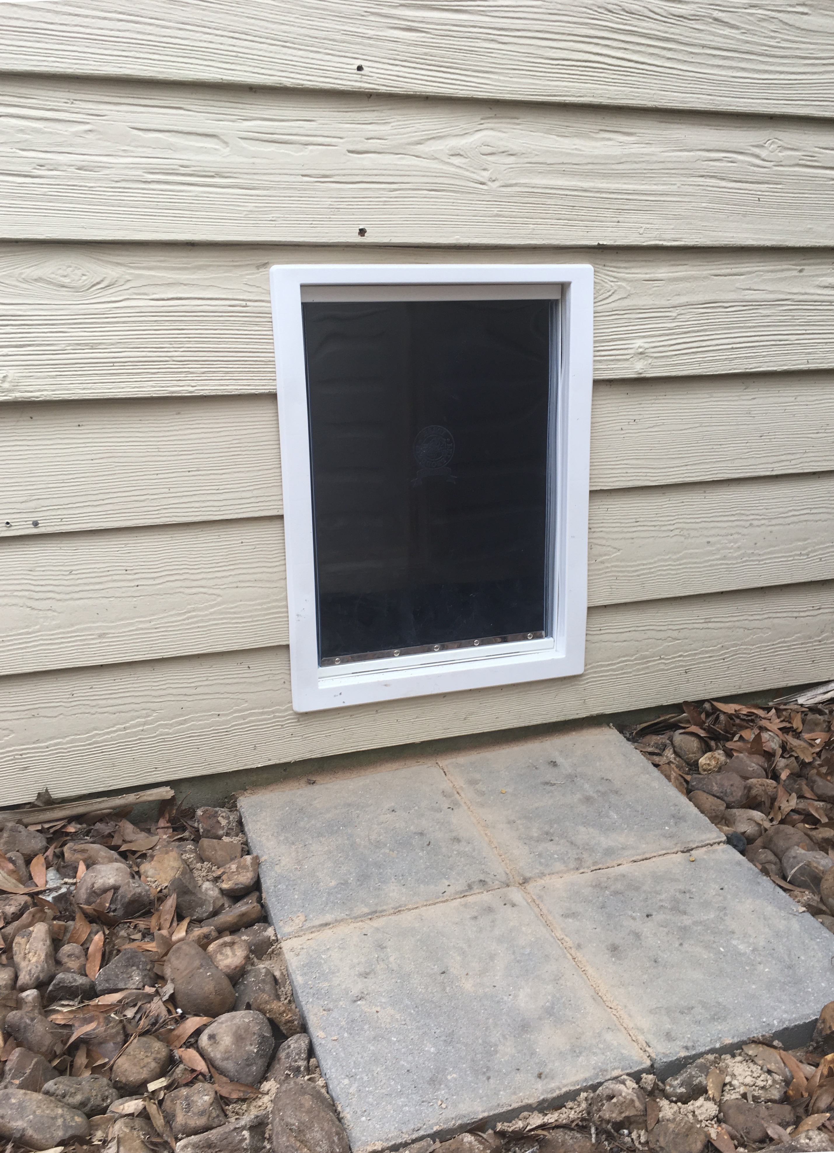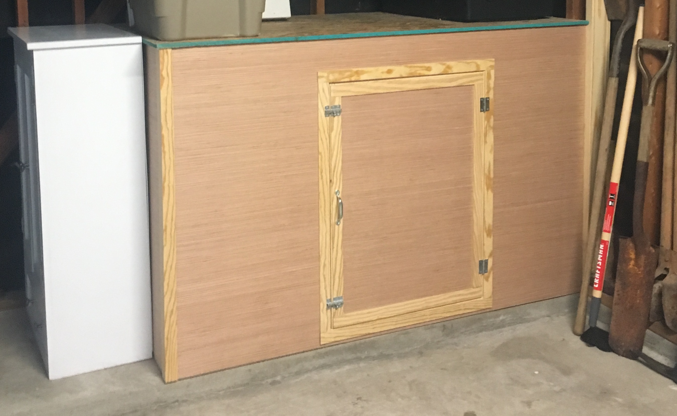 Instead of a traditional doghouse, my husband built a “dog room” inside the garage which can be accessed through a small hinged door in the garage or a doggy door on the back side of the garage. Inside is a mat and a dog bed. Originally, the plan was to install a little AC unit in the dog room because the summers will be very hot, but the dog seems to prefer to hangout on his sofa, rug, dog bed, and elevated dog bed located under the covered patio.