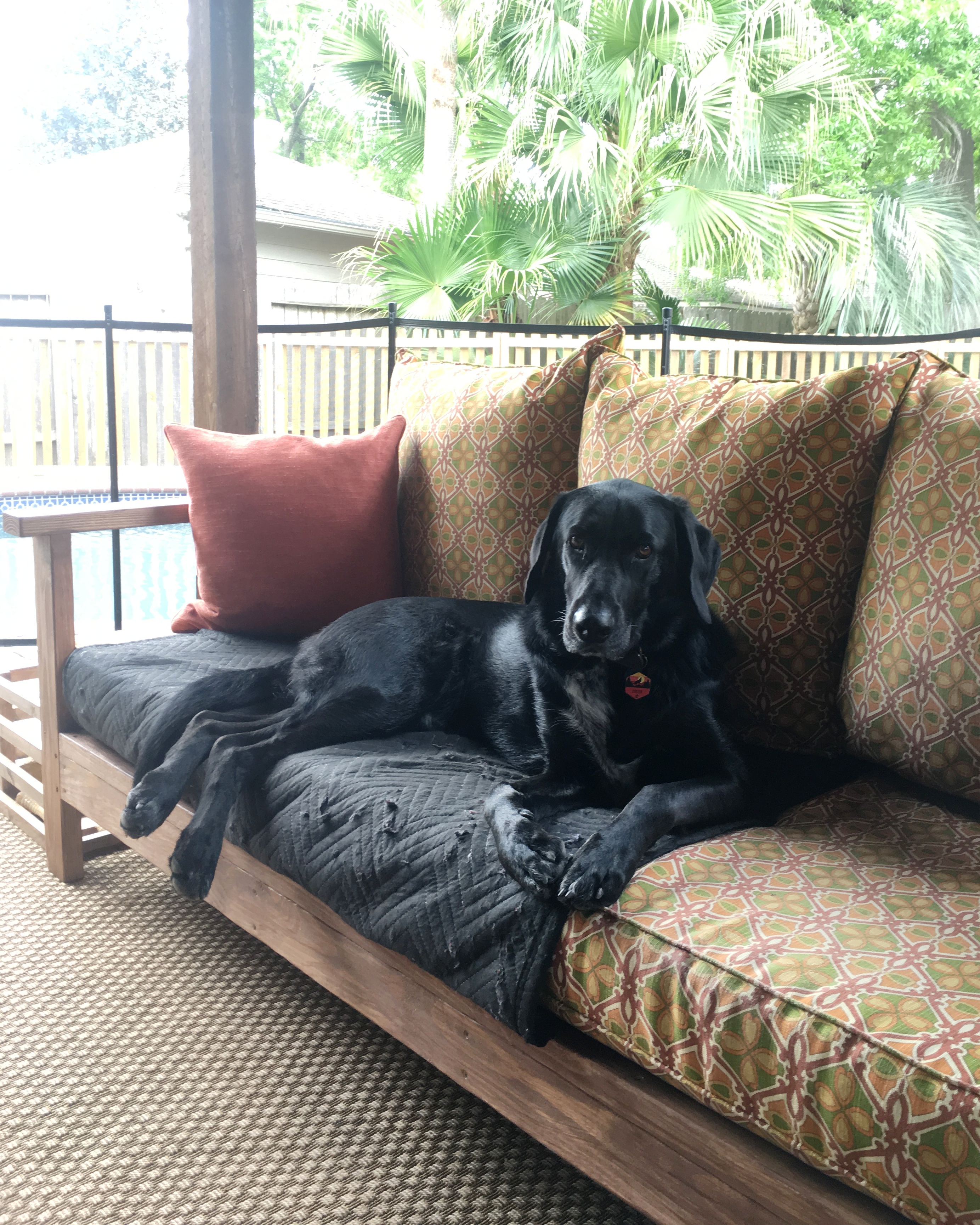 In order to transition our dog to live outside full-time, I knew he would require a sofa. He is a bit high maintenance. My mom took me to a discount fabric store where we found a great deal on Tommy Bahama Sunbrella fabric and a foam cushion. We purchased outdoor pillows from JoAnn Fabrics and a contact of the discount fabric store made the cushion and pillow covers.