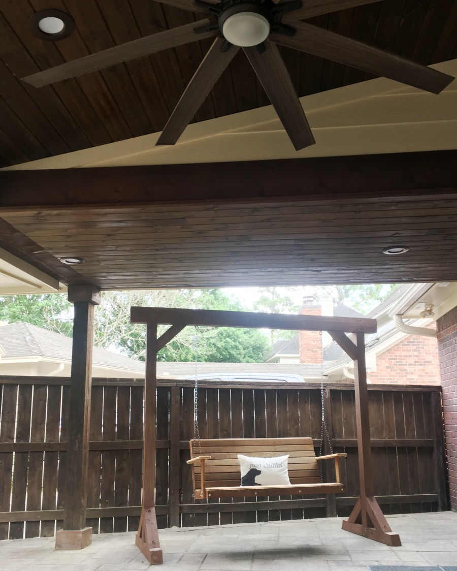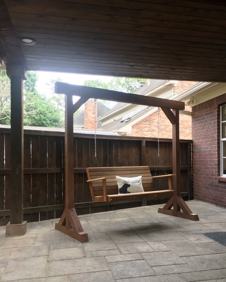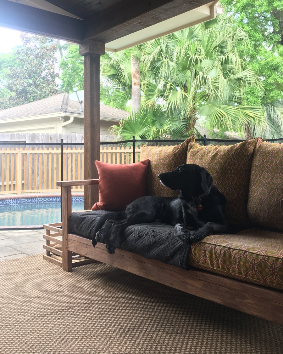My husband made a little crate for the dog’s toys and a swing frame for a swing he previously made from redwood. My mom purchased the swing pillow from Pottery Barn. The more time I spend outside, the more I have realized that we need chairs and tables. The dog typically stretches out on the couch so I plan on purchasing two wicker chairs and a couple of side tables so we have more seating options.