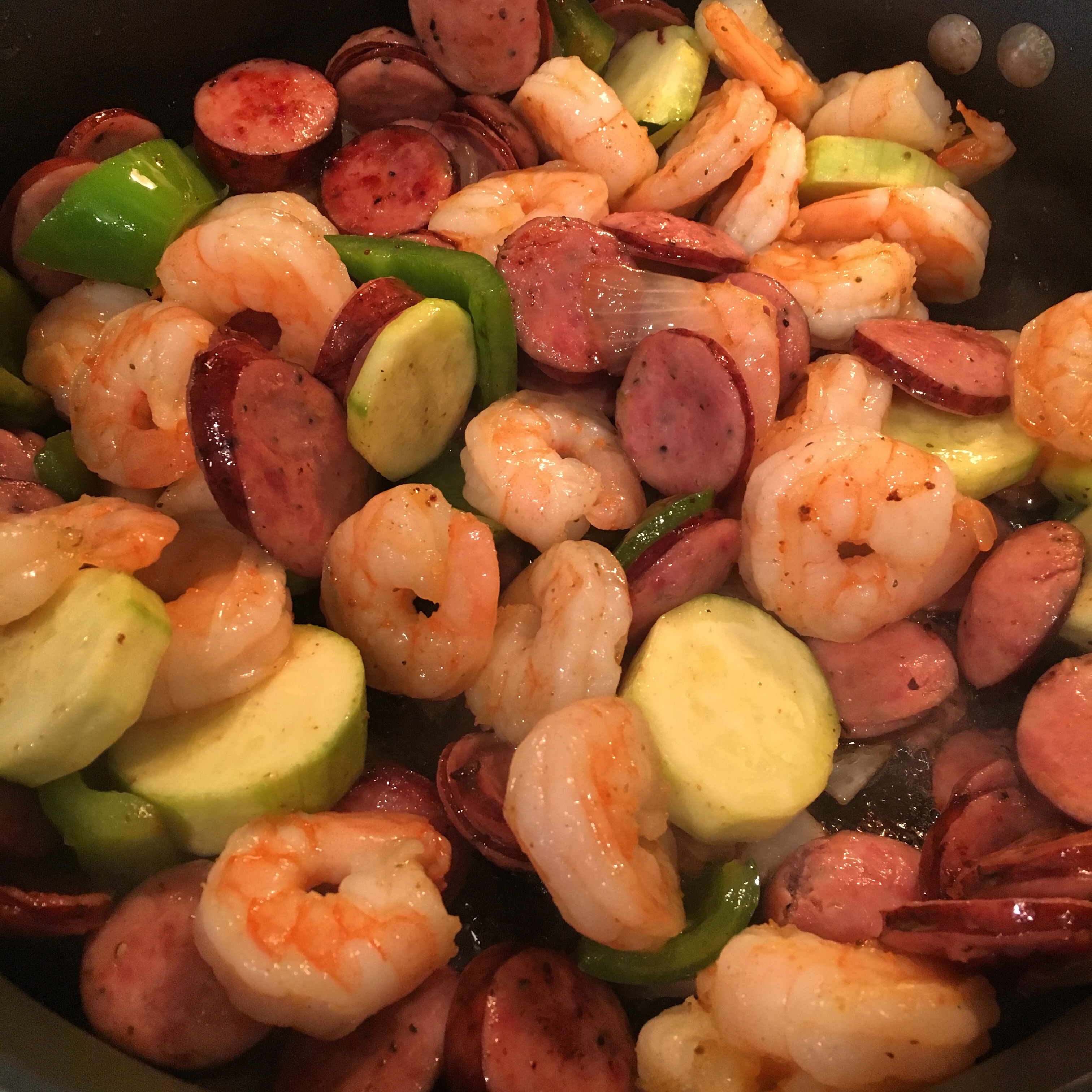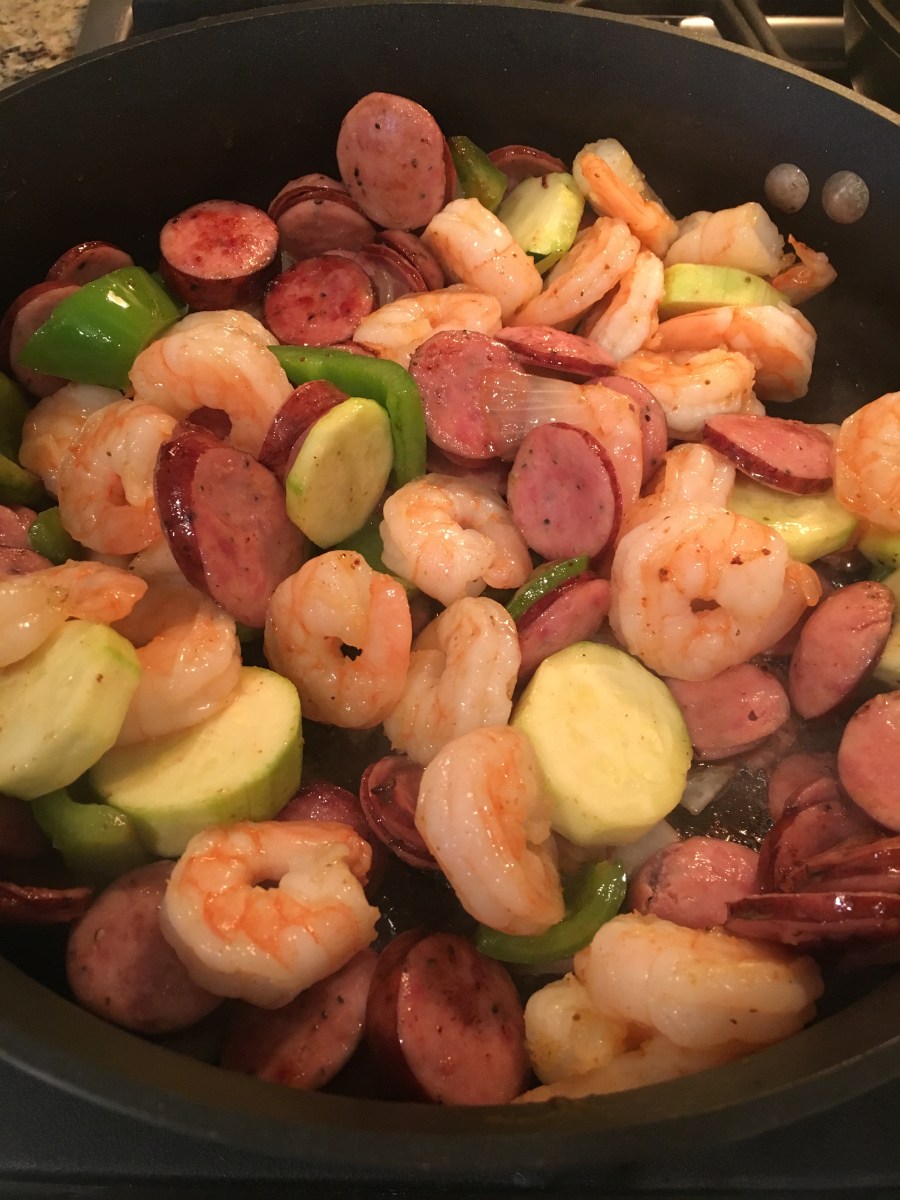 I found this Shrimp and Sausage Paleo Skillet Meal and thought I would give it a try. I did find that I did not need the chicken stock and did not use the chopped parsley or red bell pepper. I actually used fewer vegetables than suggested because I live with an anti-vegetable person (though he did eat the zucchini) and I forgot about the red pepper flakes.