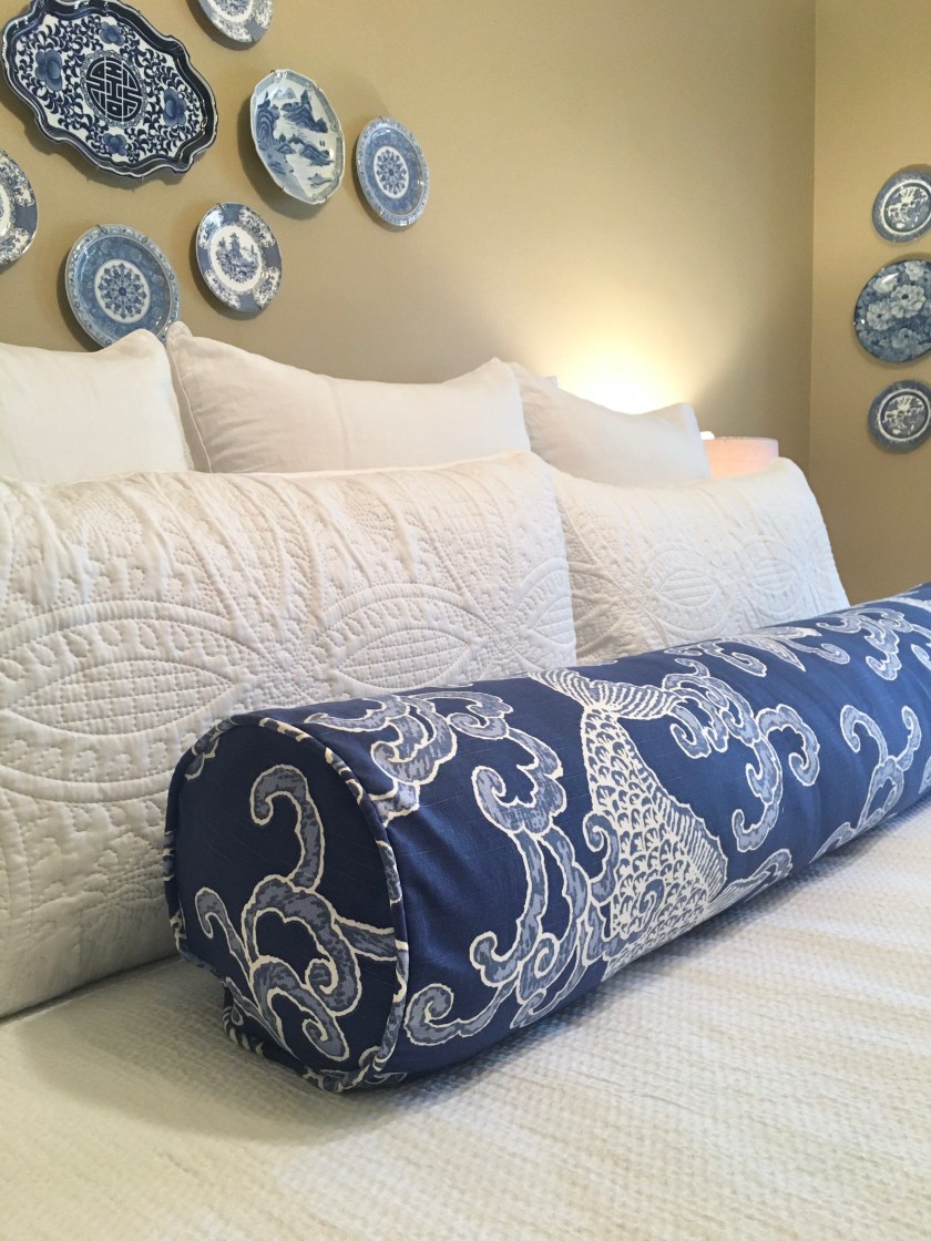 Two years ago I found these two blue and white lumbar pillows at HomeGoods and I like them but I decided they might look better in the recliners beside the window. So whatever fabric I chose for the bolster needed to at least coordinate with the blue and white lumbar pillows.