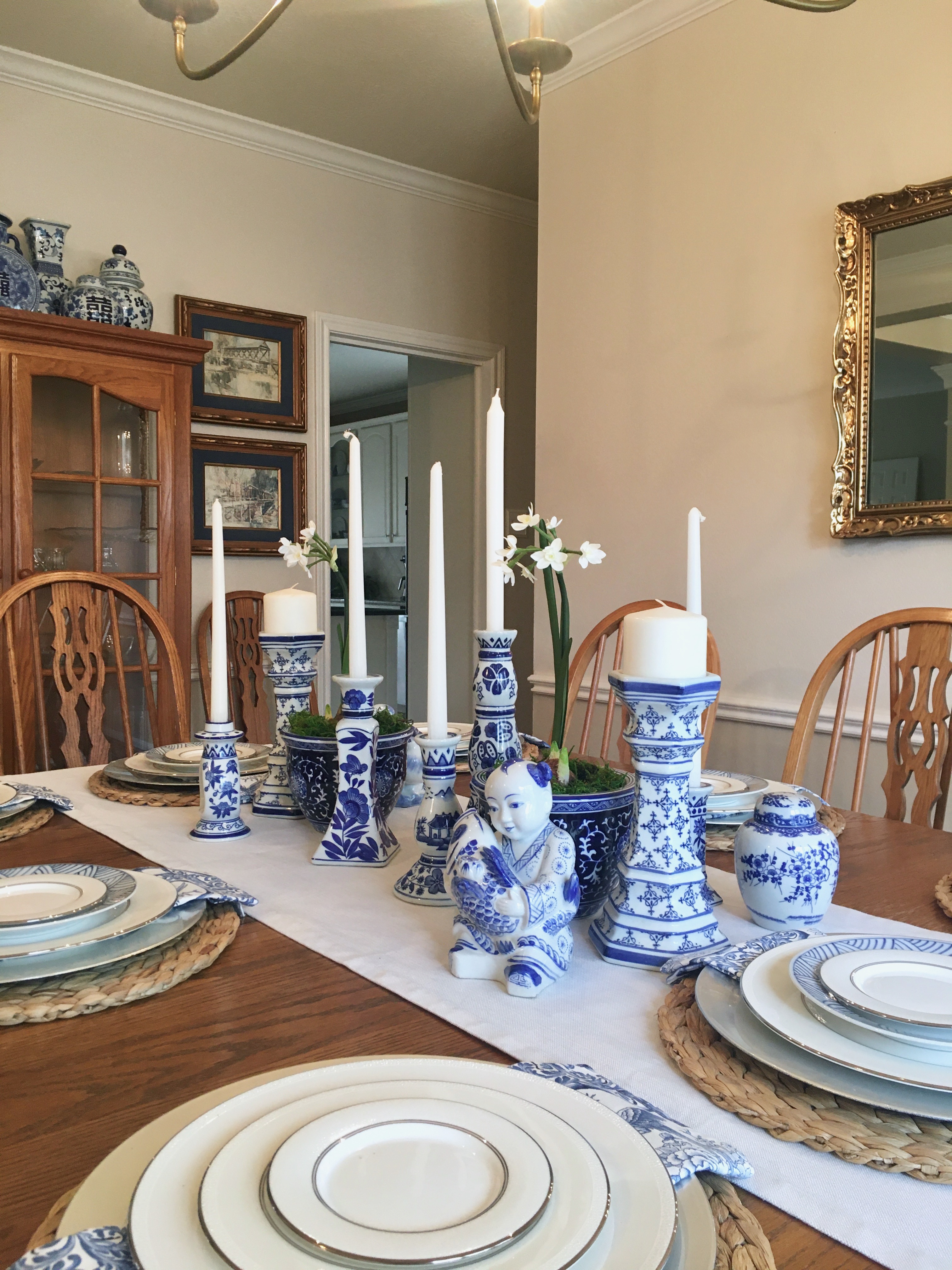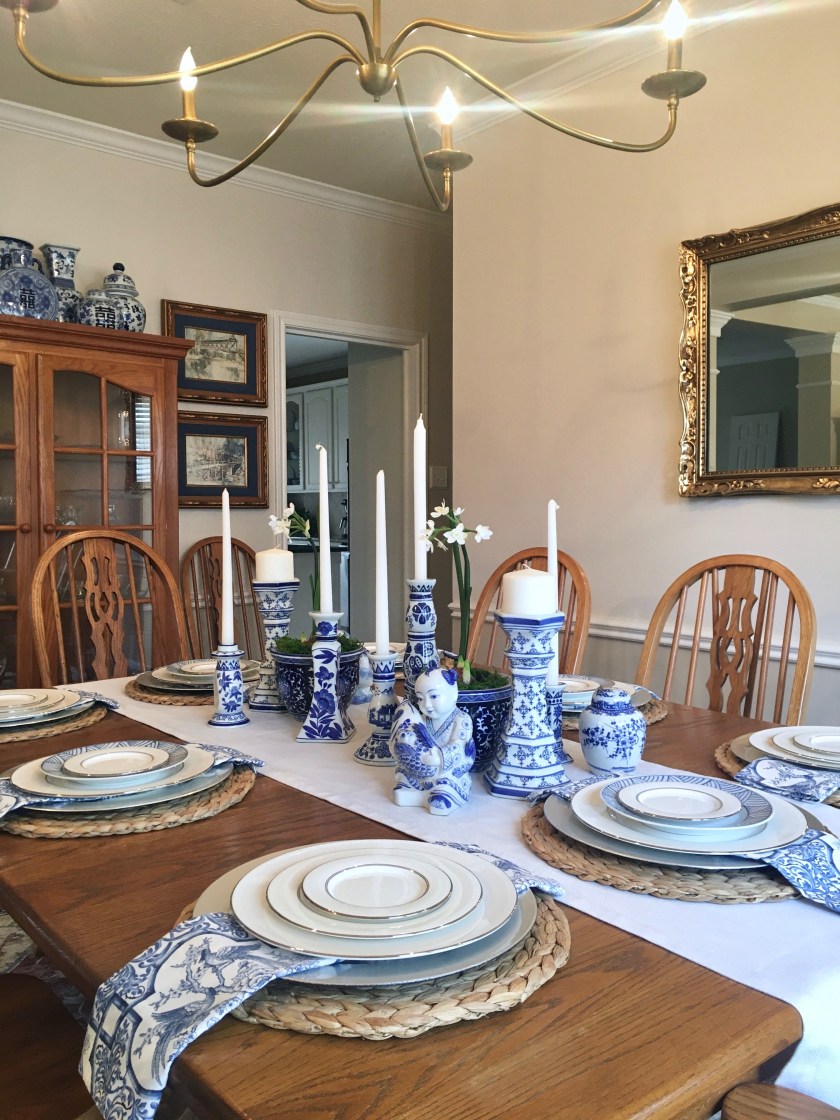 The paperwhites look pretty real. I had planned to have four in a larger blue and white bowl between the two small pots but since that did not work out, I broke out all the blue and white candlesticks and a few blue and white figurines. I am never satisfied with any tablescape I set up but this will do for now.