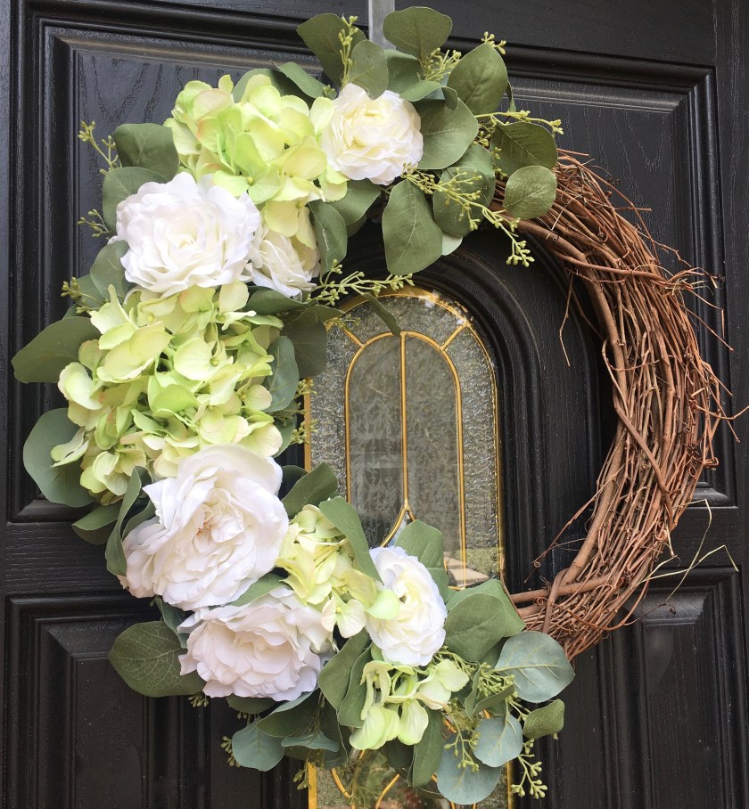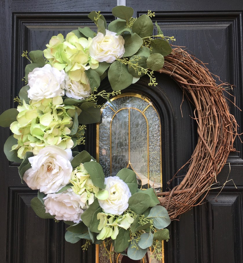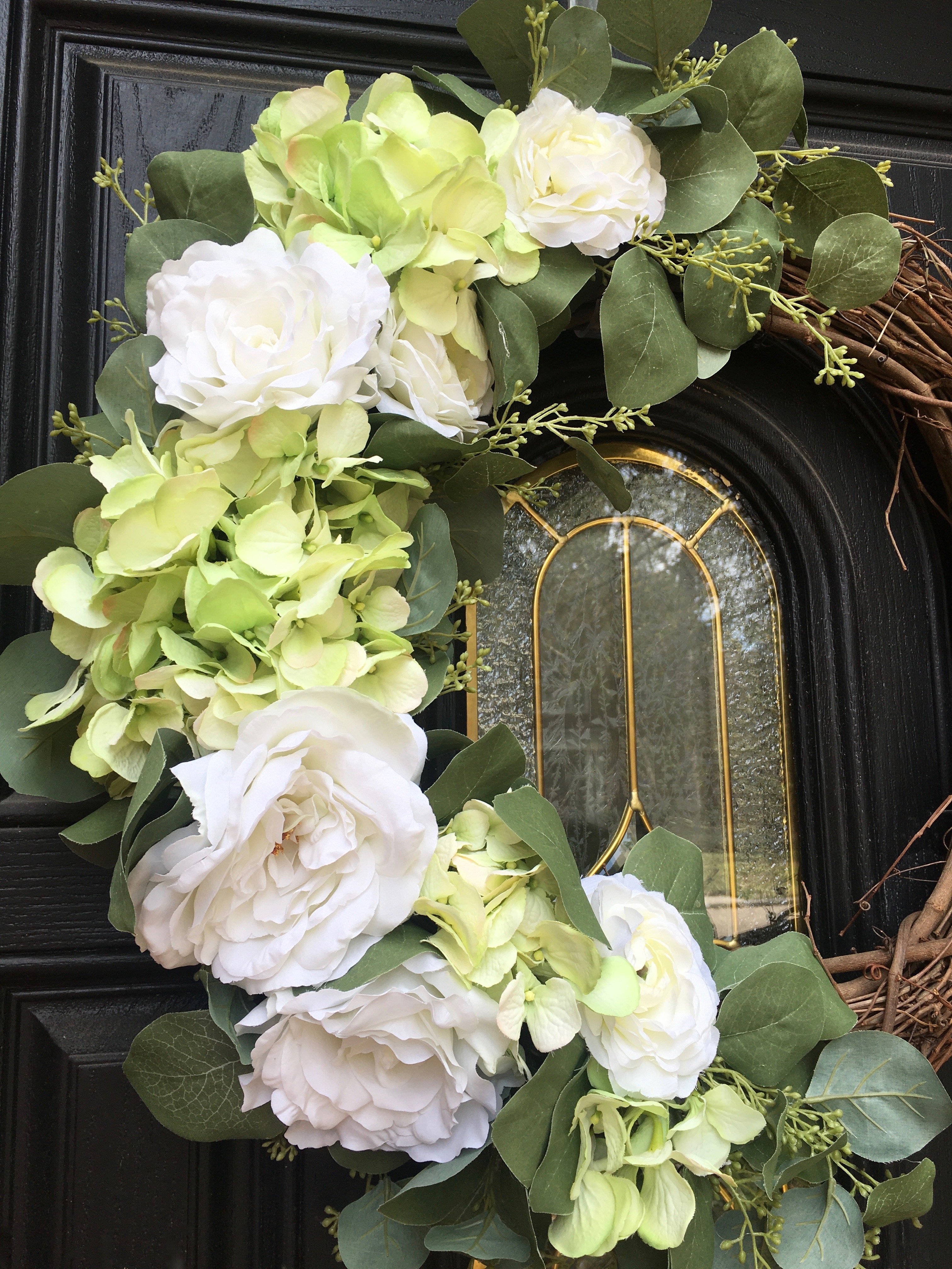 I have a bin in my storage room labeled “FLORAL” and I decided to use the garland and stems that were inside bin. I purchased a grapevine wreath for about $7 from Joann Fabrics and starting searching Pinterest for ideas. I came across this hydrangea wreath and thought I could use the eucalyptus garland I found inside the floral bin in place of their clematis bushels. I do prefer the look of the wreath with the clematis bushels but the eucalyptus will do. I hot-glued everything onto the wreath. I have enough eucalyptus, hydrangeas, and roses to finish the other side but I am warming up to the asymmetrical look.