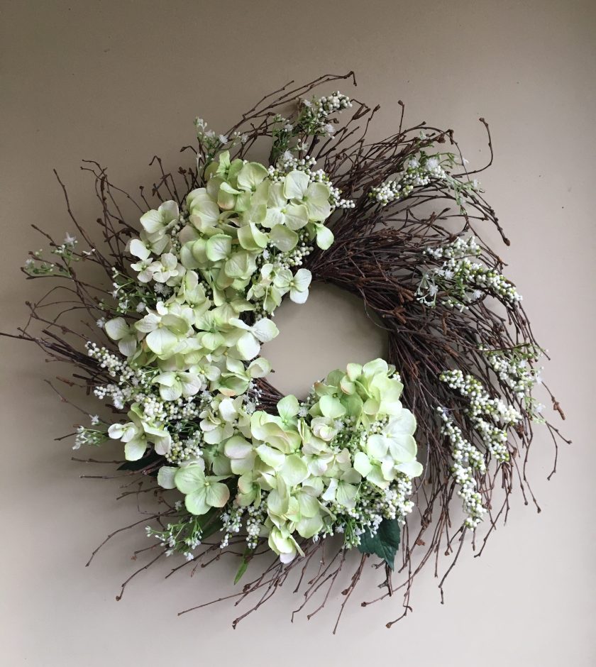 I purchased this birch stick wreath from Joann Fabrics. I can’t decide how I feel about it. It’s hanging on the back patio door, which hopefully, my dad will help me replace at some point this year. The wreath has too much of the same green hydrangea, but again, I just used what was in the bin. I did have some white roses and white peonies but they didn’t look right. I think some white wisterias, lilacs, mums, geranium bushes, or any white clump of small flowers would break up all those green petals. Maybe eventually, I will wander over to Hobby Lobby and pick something up and add it to the wreath.