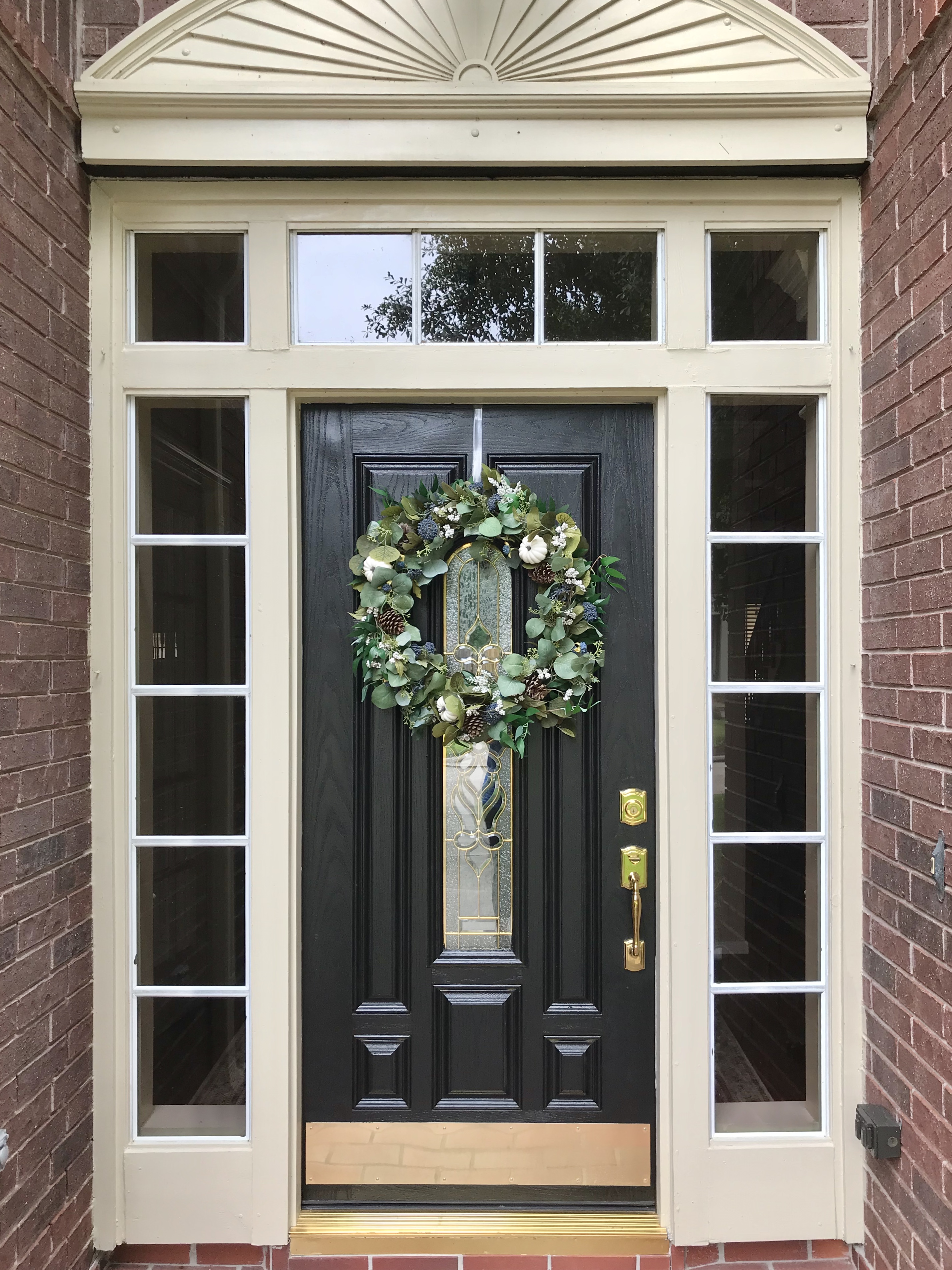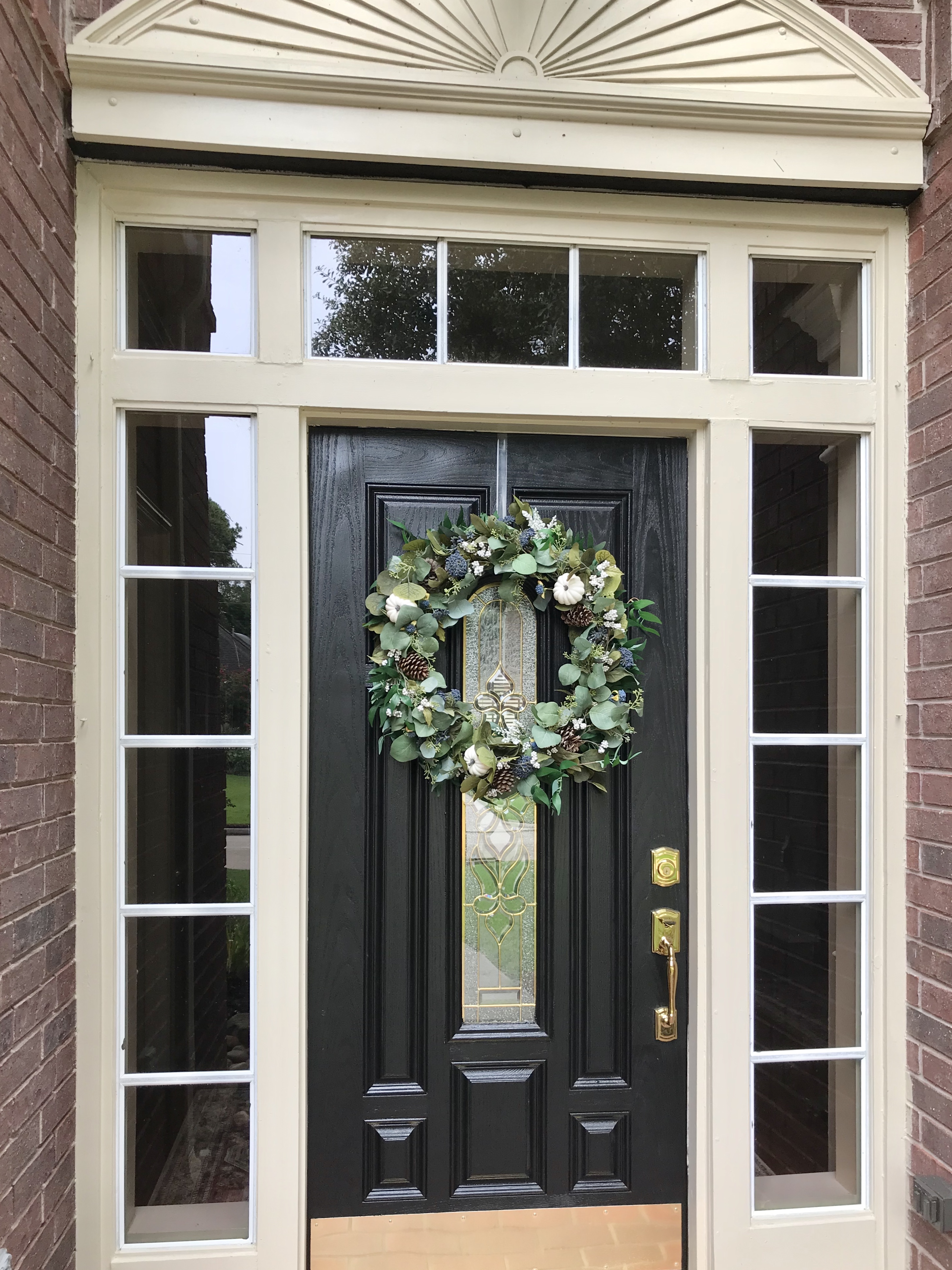 Since making this wreath last year, I have painted the front door and frame, replaced the door knob and deadbolt, and made pumpkin topiaries to match the wreath. However, the pumpkin topiaries are just too short. So for now, just a wreath will have to do.