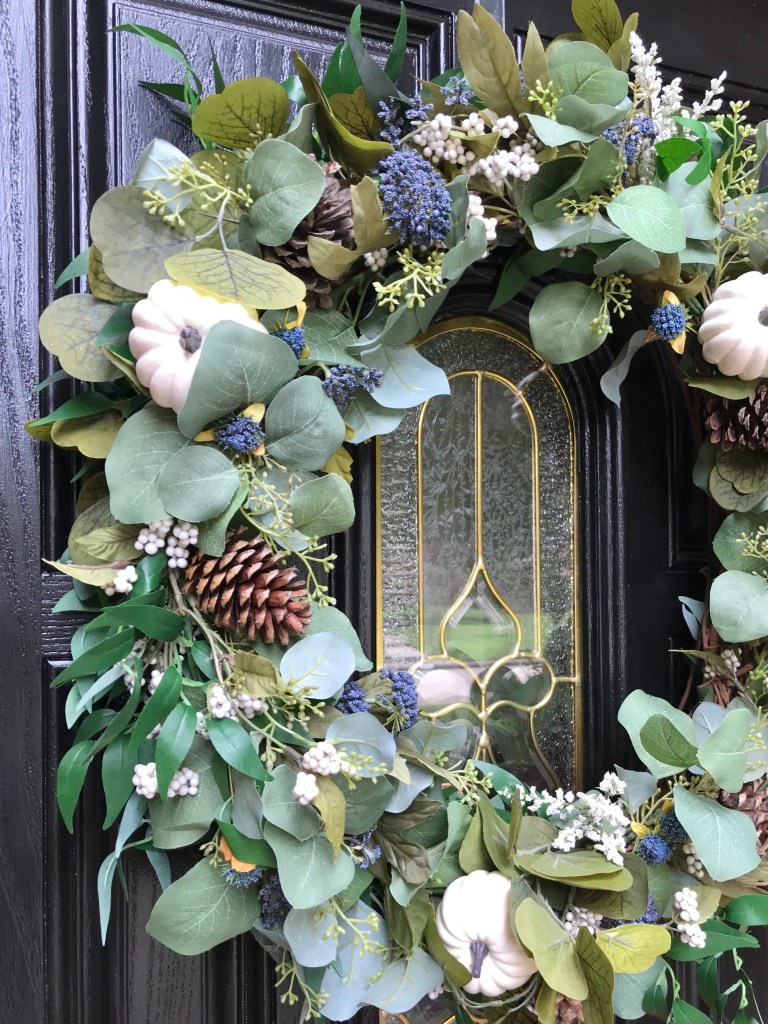 Last year I wanted something that would show up on the front door and would coordinate with the interior decor. I found white pumpkin picks at Hobby Lobby, as well as eucalyptus garland, deep blue flowers, and white floral stems.