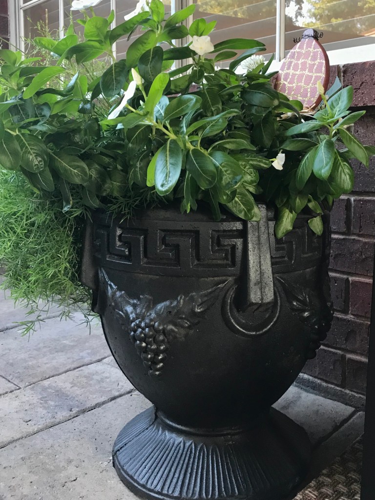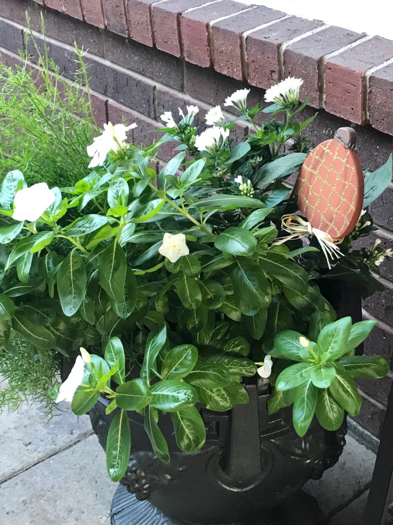 Matt has made me some planters that I am also going to fill soon. This planter was here when we moved in. I spray painted black and filled it with white asparagus fern, pentas, and vinca. I recently found these cute wooden pumpkins on metal stakes at Hobby Lobby so I put one in this pot and one in the pot of mint.