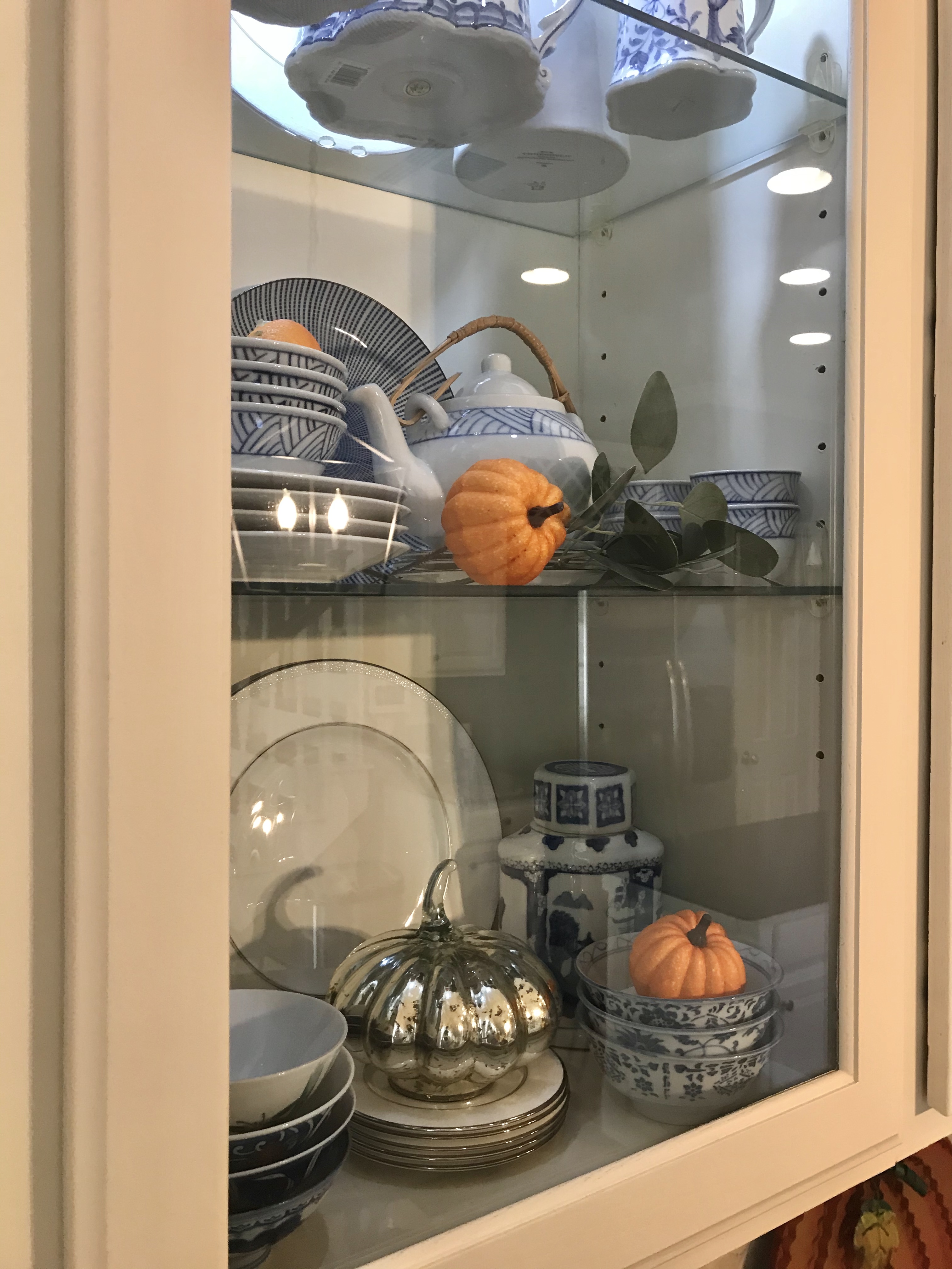 I continued the dining room theme of oranges and eucalyptus picks to the kitchen. I had a couple of mercury glass pumpkins left over so I put them, eucalyptus, pumpkins, and oranges in the display cabinet in the kitchen.