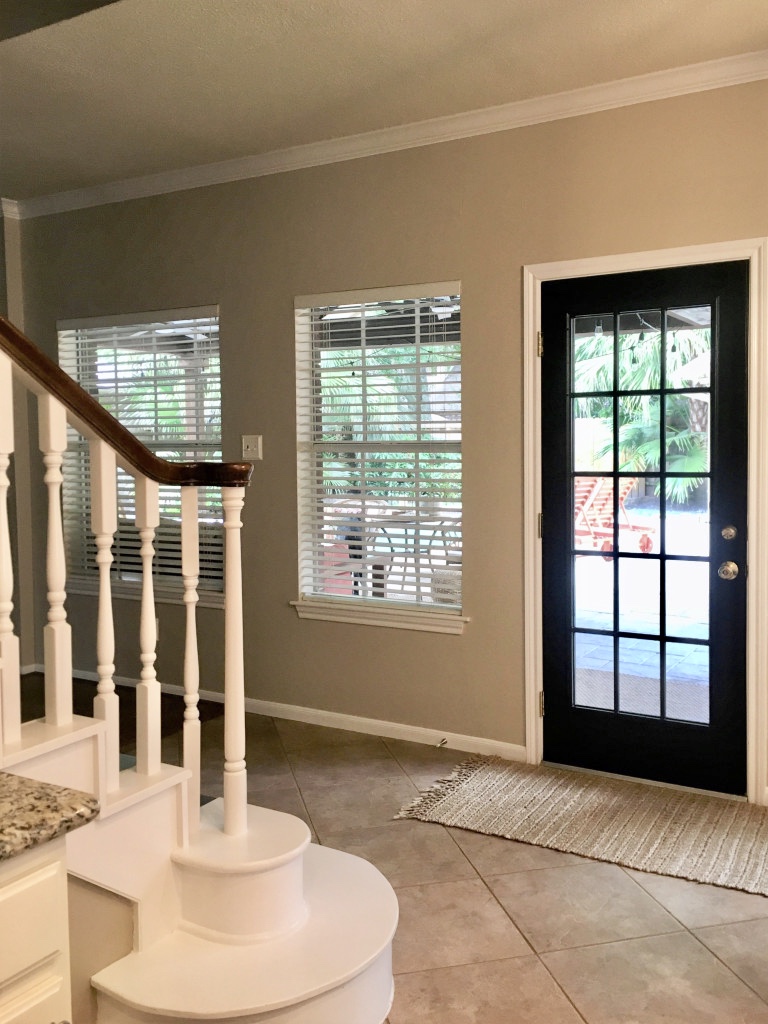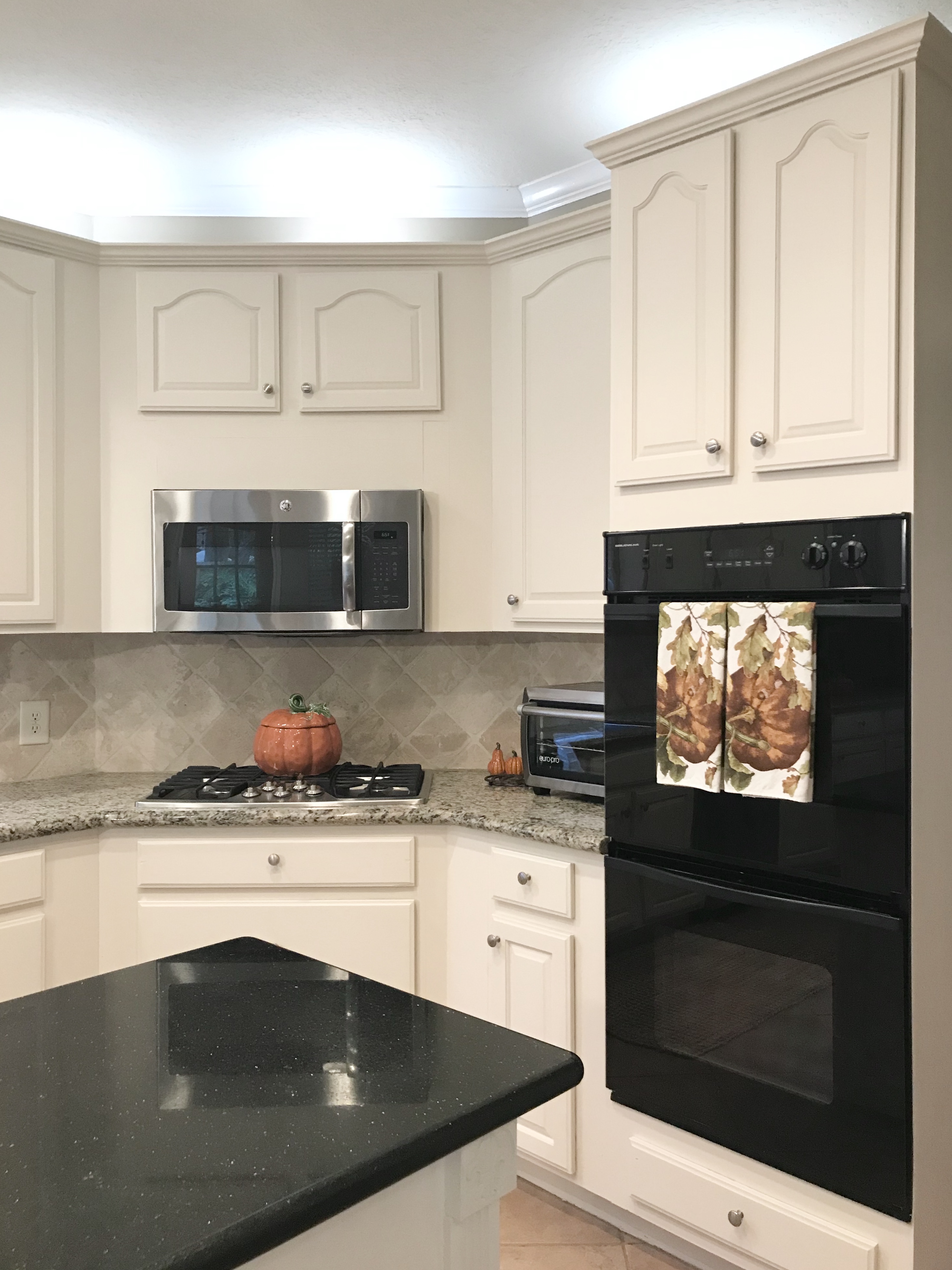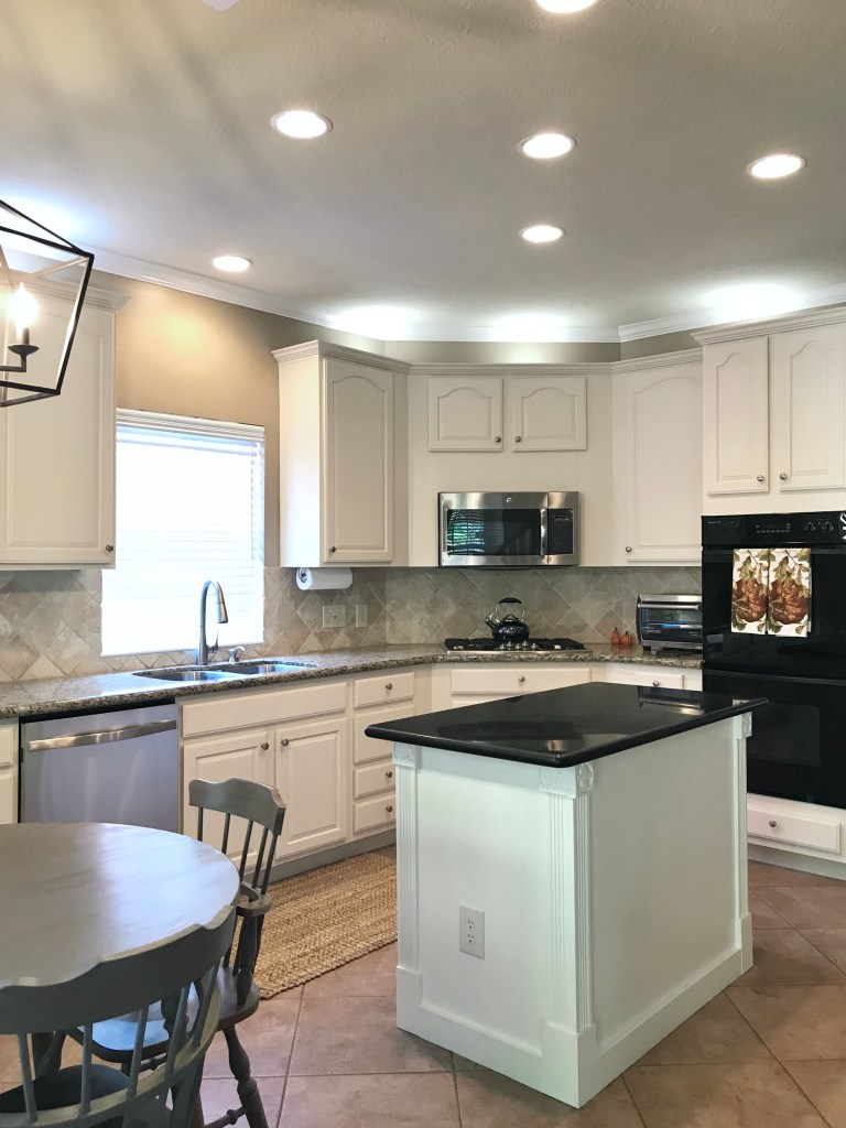 We have done a lot of updating to the kitchen. We removed the curtain rods, replaced the blinds and vents, changed out all the knobs and doorstops, painted the island, replaced can light rings and bulbs, replaced the faucet and soap dispenser, replaced the light over the table, replaced all the light switches, plates, and plugs, replaced the glass cabinet lights and lights above the cabinets, replaced the hardwood floor transition strips, painted the backdoor, trim, and baseboards and replaced the door hinges.