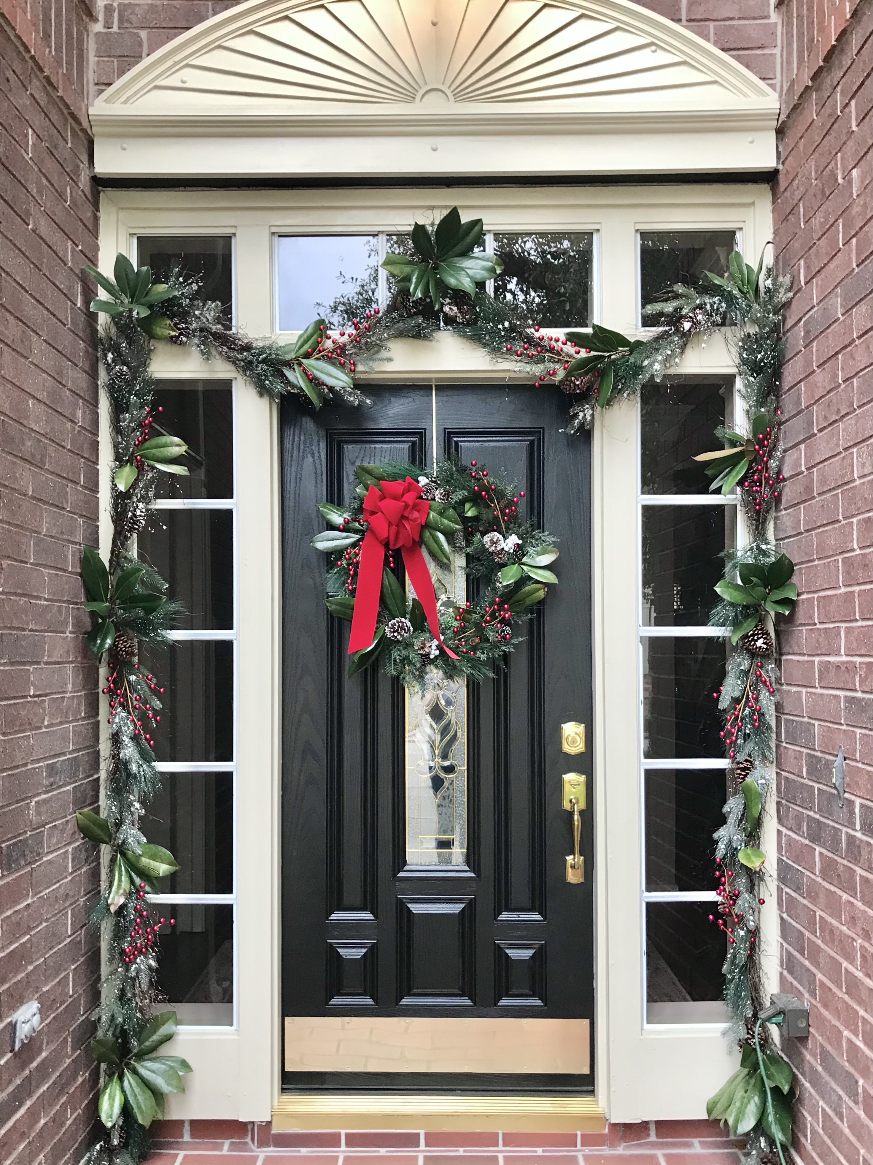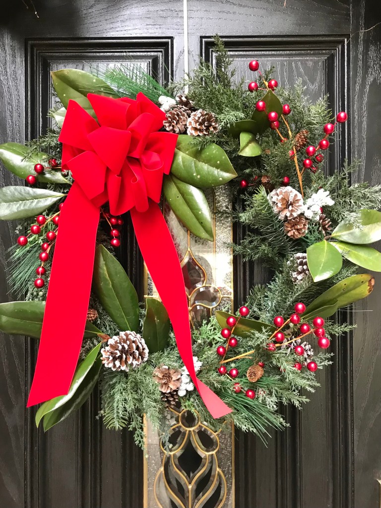 I added magnolia leaves to the front door garland and wreath. If I had more leaves, I would redo the wreath completely but it’s a week before Christmas, so it’s just fine.