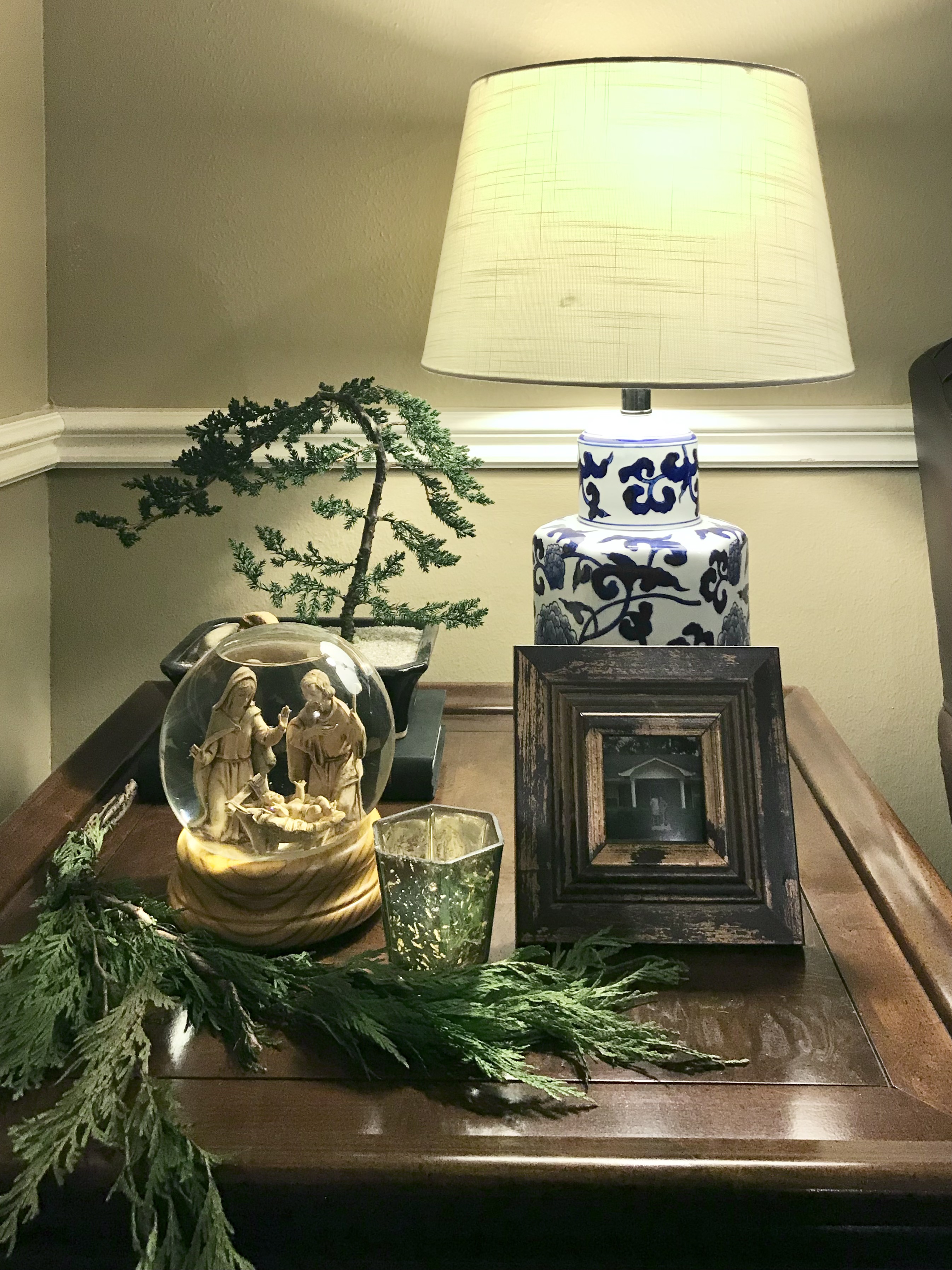 I placed the magnolia stems and some cedar on the foyer table.