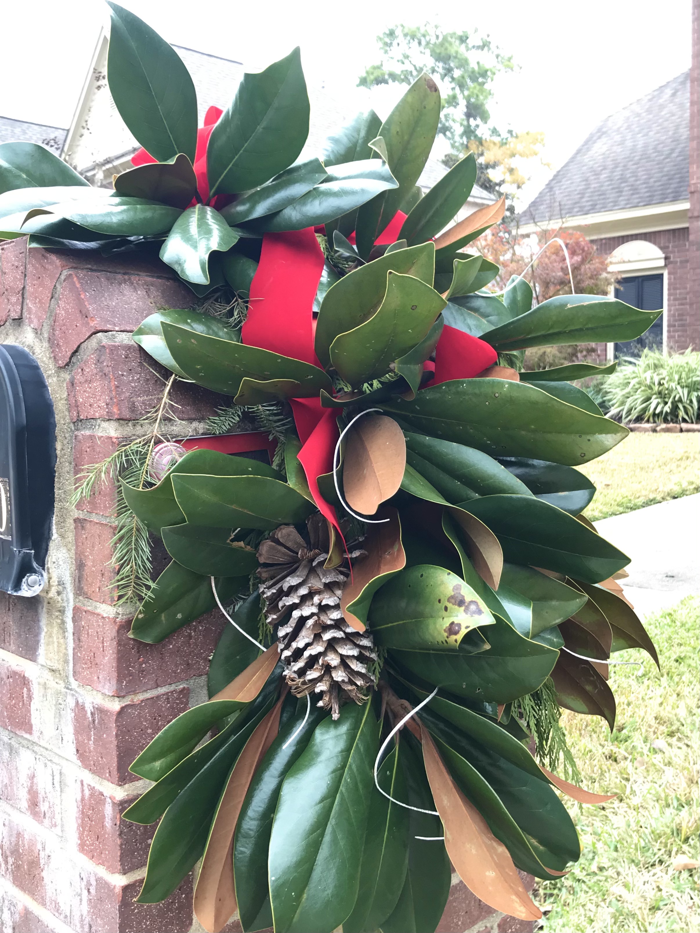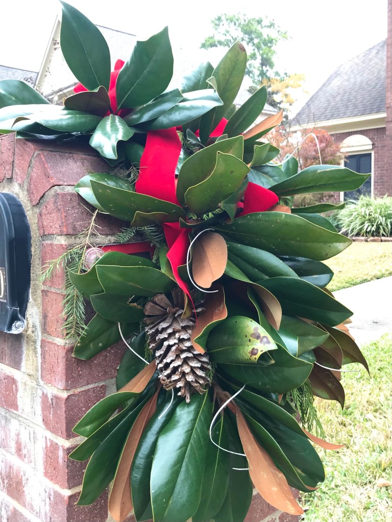 My original plan was to visit a Christmas tree farm or store selling trees to get limbs and I hoped to find someone with a magnolia tree that did not mind cutting a few limbs. I finally went to Lowe’s and purchased cedar garland and got a few straggly Christmas tree limbs. I worked on a floral arrangement for the mailbox using the cedar garland and the tree limbs for hours. What I ended up with was not what I had envisioned.