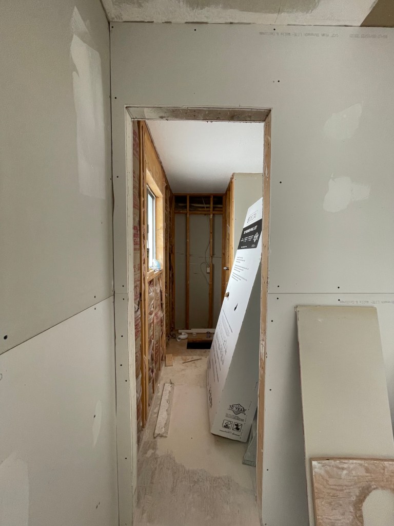 The guys removed damaged sheetrock, popcorn ceiling, the shower in the master bathroom, and the tub in the hallway bathroom.
