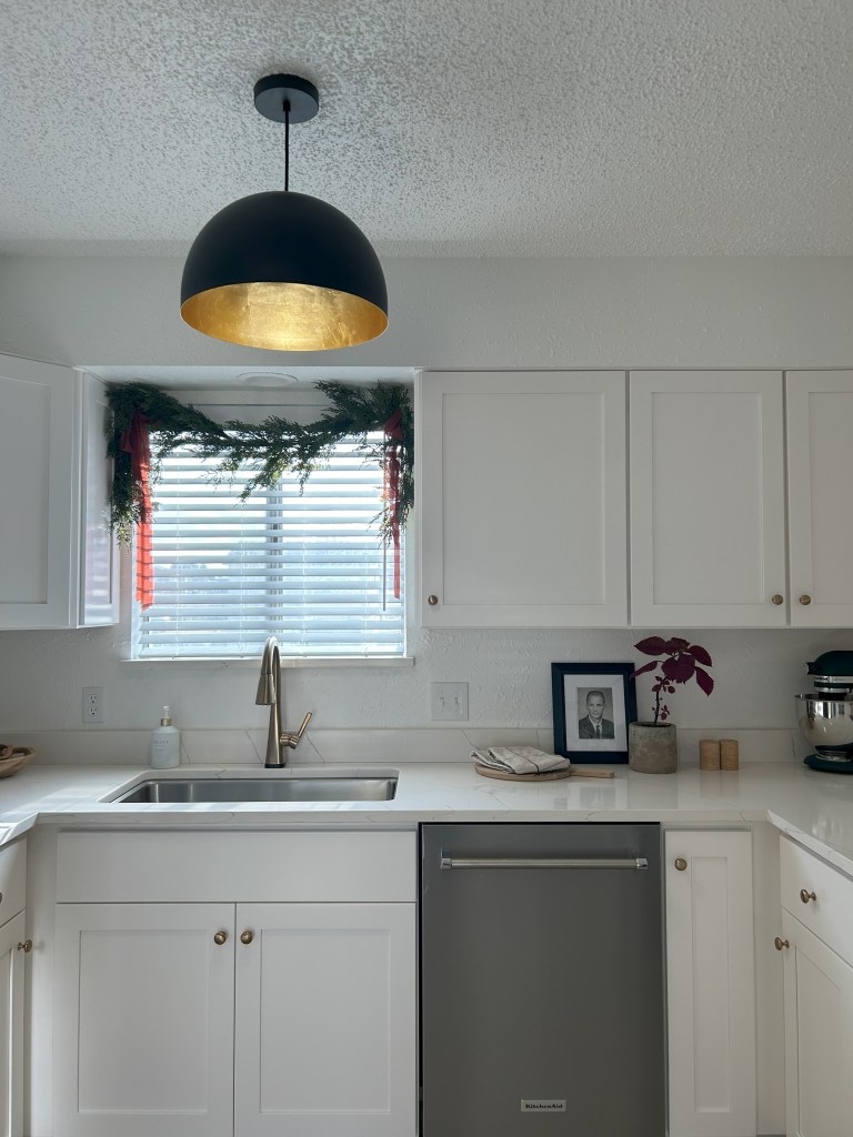 The kitchen renovation is almost done. Just a few more things to do. I finally got the command strips to cooperate with the wall texture and the garland stopped falling into the sink. I used the terracotta fabric ribbon by attaching strands to a bobby pen and then attaching it to the garland.