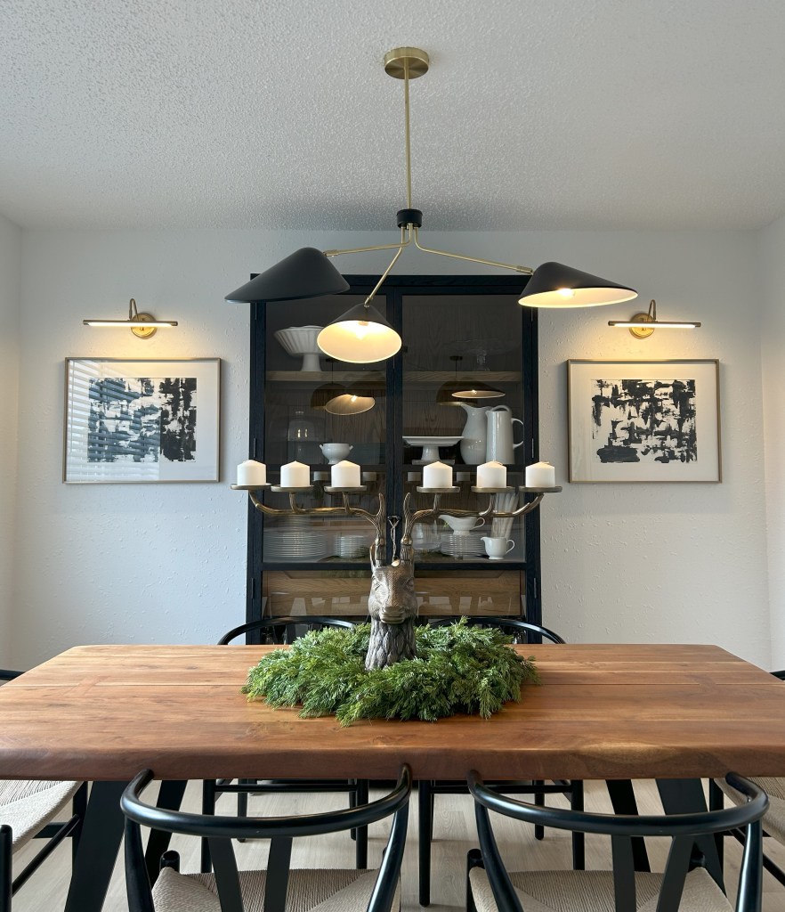 My friend Beth, told me about a huge sale on this stag I had been eyeing. She suggesting using a wreath around the base. My bells on the cabinet knobs had a terracotta ribbon but from the front it looked like the stag was wearing a hairbow.