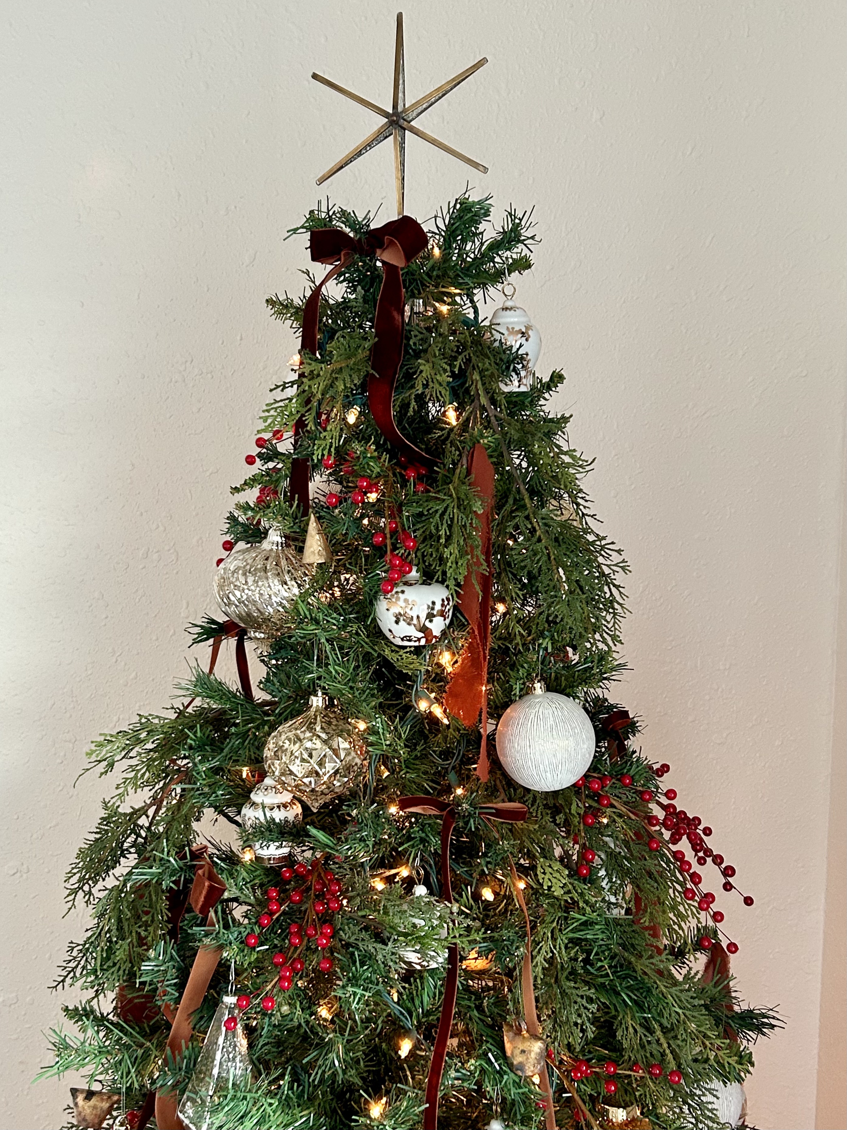 I decided out that I didn’t want the same style tree this year so I nixed the bright gold glitter and the shiny red ornaments. I found a ribbon called “gingerbread” which is a dark reddish brown and a fabric ribbon in a terracotta color to use around the house.