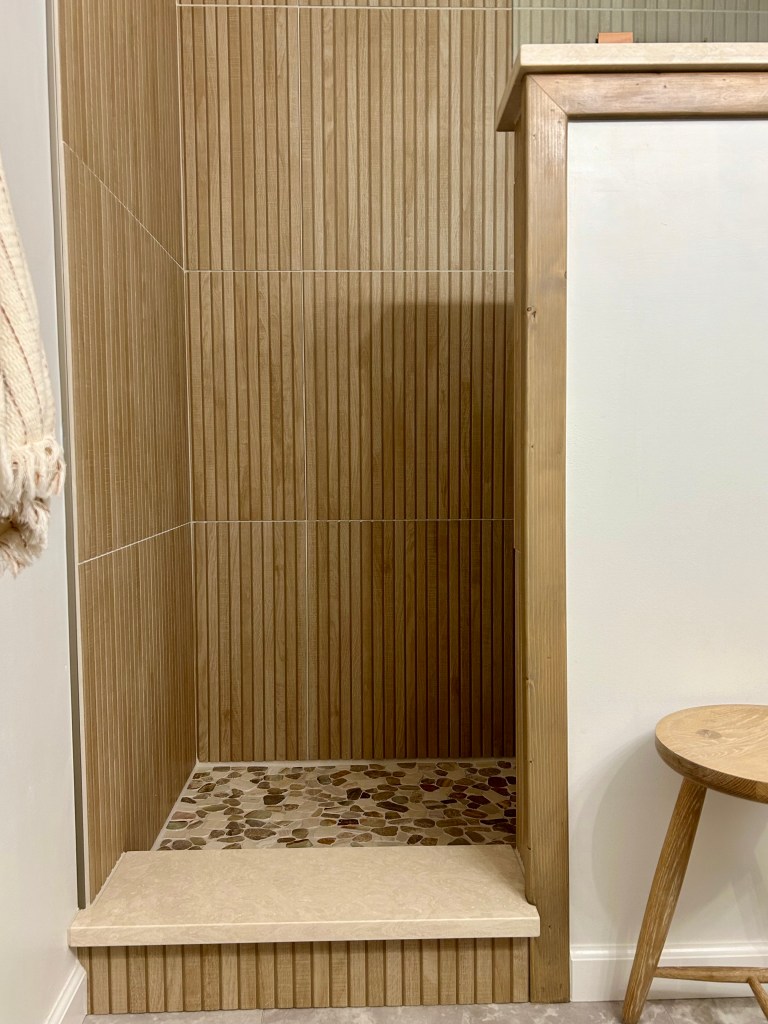 I needed something to fill the empty shower wall but I wanted to find the perfect color to coordinate with the vanity, shower trim and tile. I found this stool and thought it was perfect and could not understand the price tag. It went on super sale- like 80% off one day so I bought it and I use it every morning to get ready.