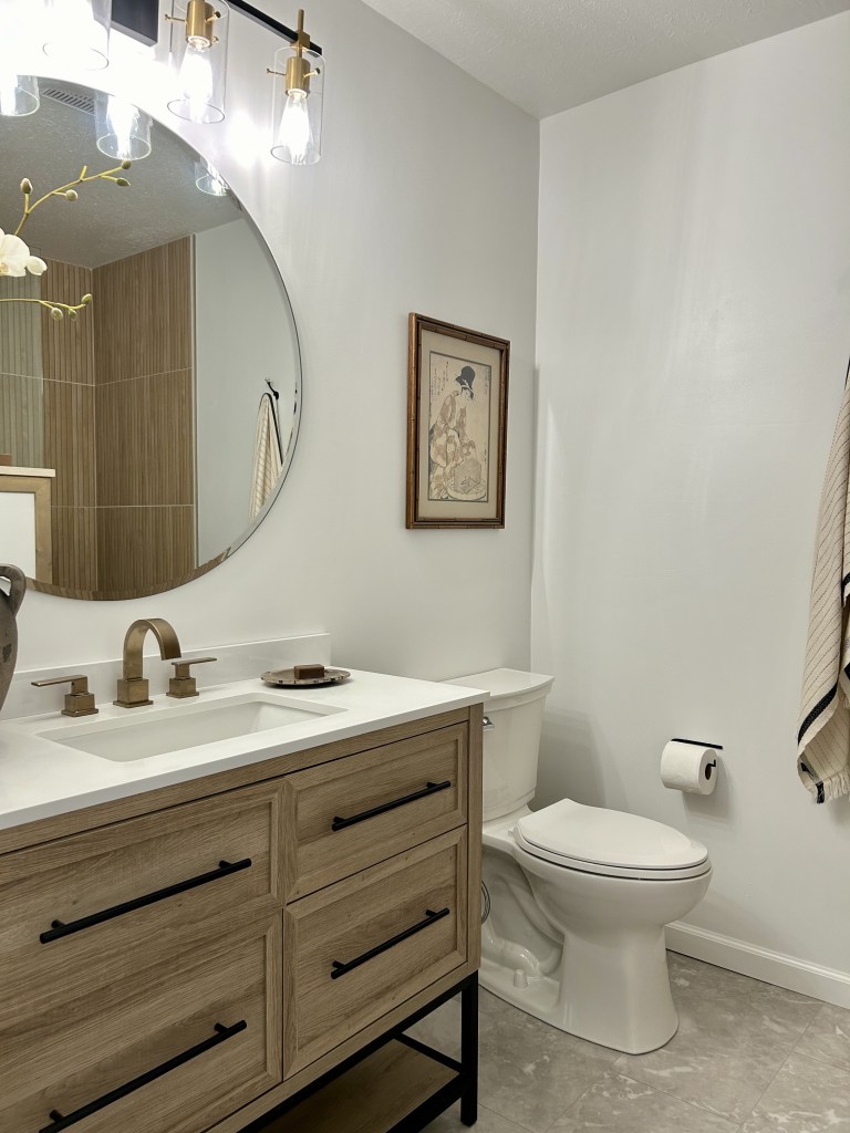 This bathroom was hideous. I had never seen anything like this in my entire life. Obviously, there was never a question about painting, installing new flooring, and replacing the light fixture, mirror, and toilet.