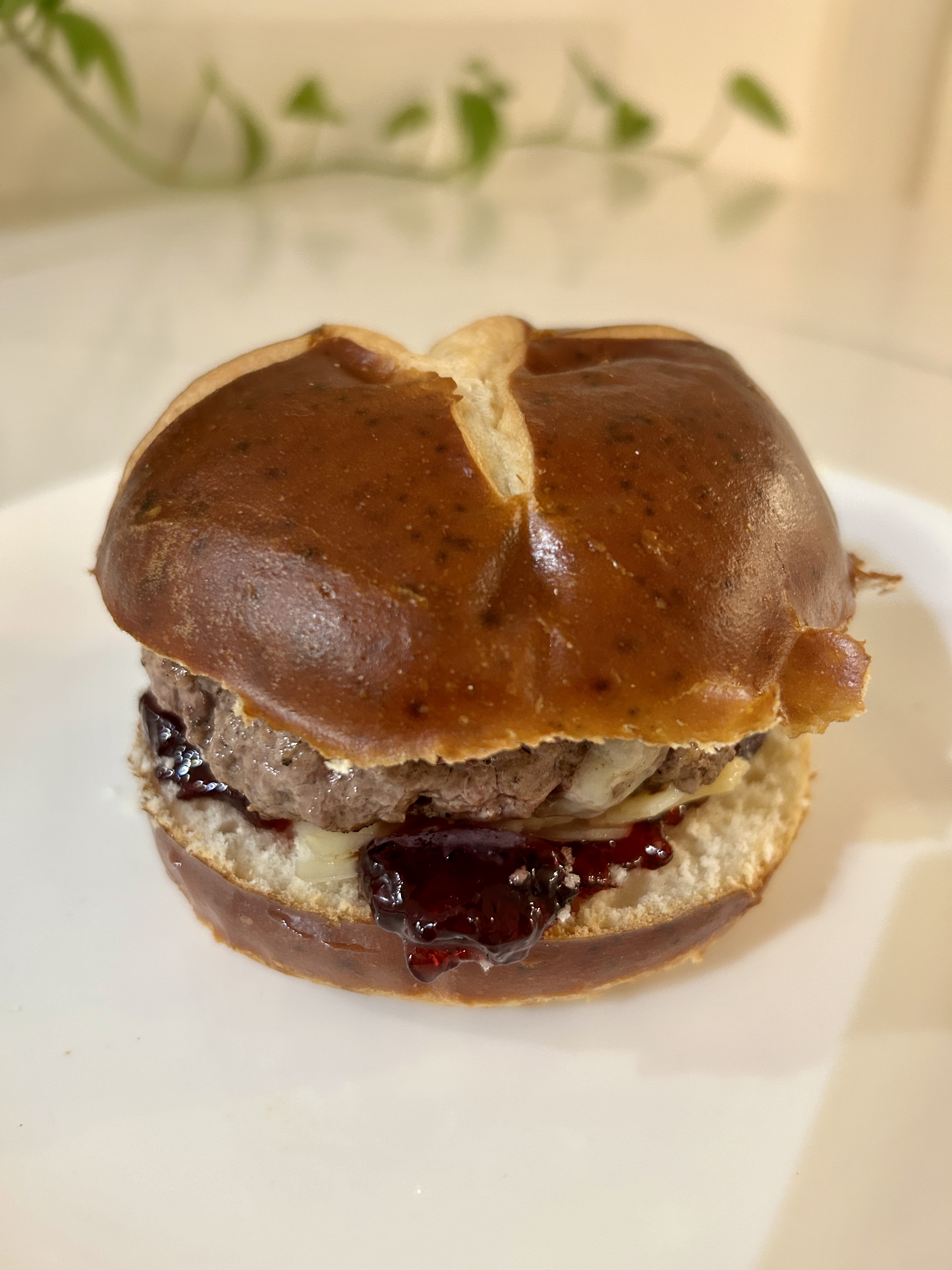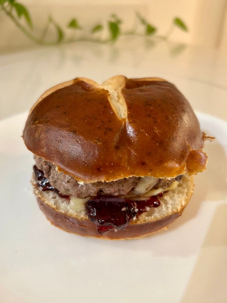 This is not a new concept, but here’s my take on the peanut butter and jelly hamburger. I used a peanut butter with honey (Skippy Natural with Honey), and the cheese I had on hand which was an asiago, parmesan, and Romano mix.