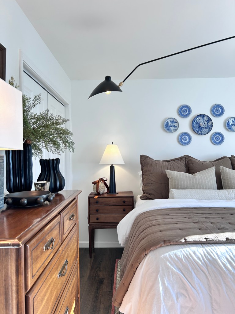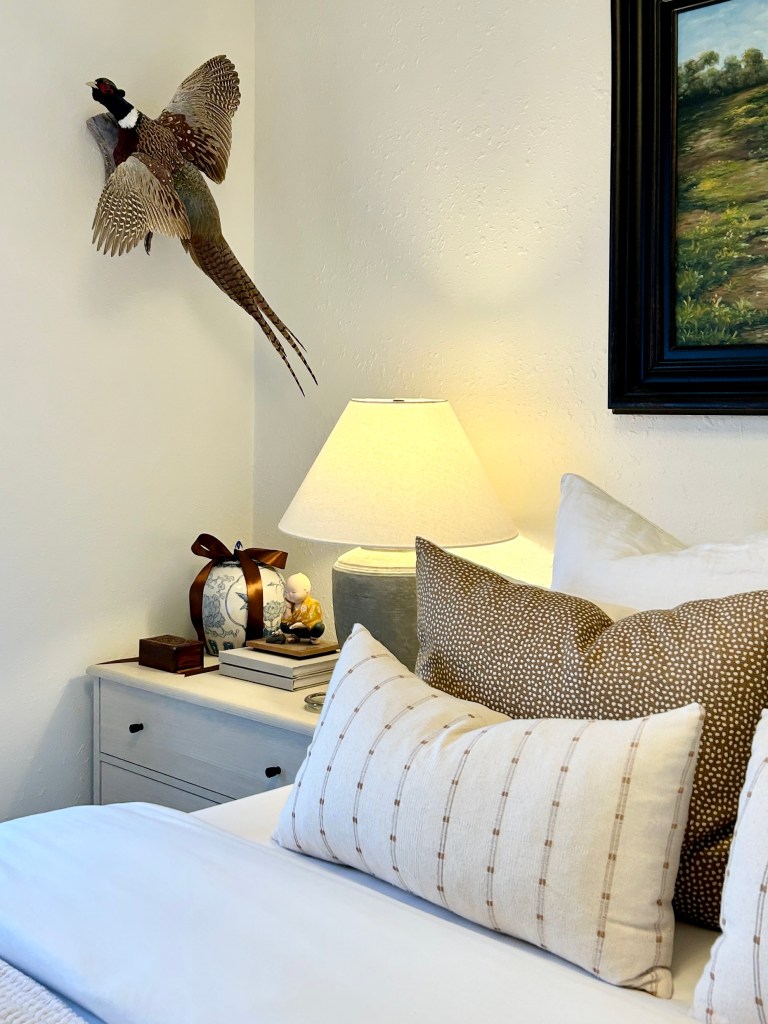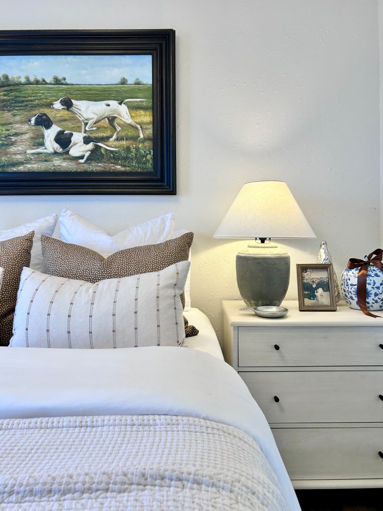 This bedding was in the other room but once I purchased the cognac quilt and shams, I decided that what was in this room originally matched better so I swapped everything over.