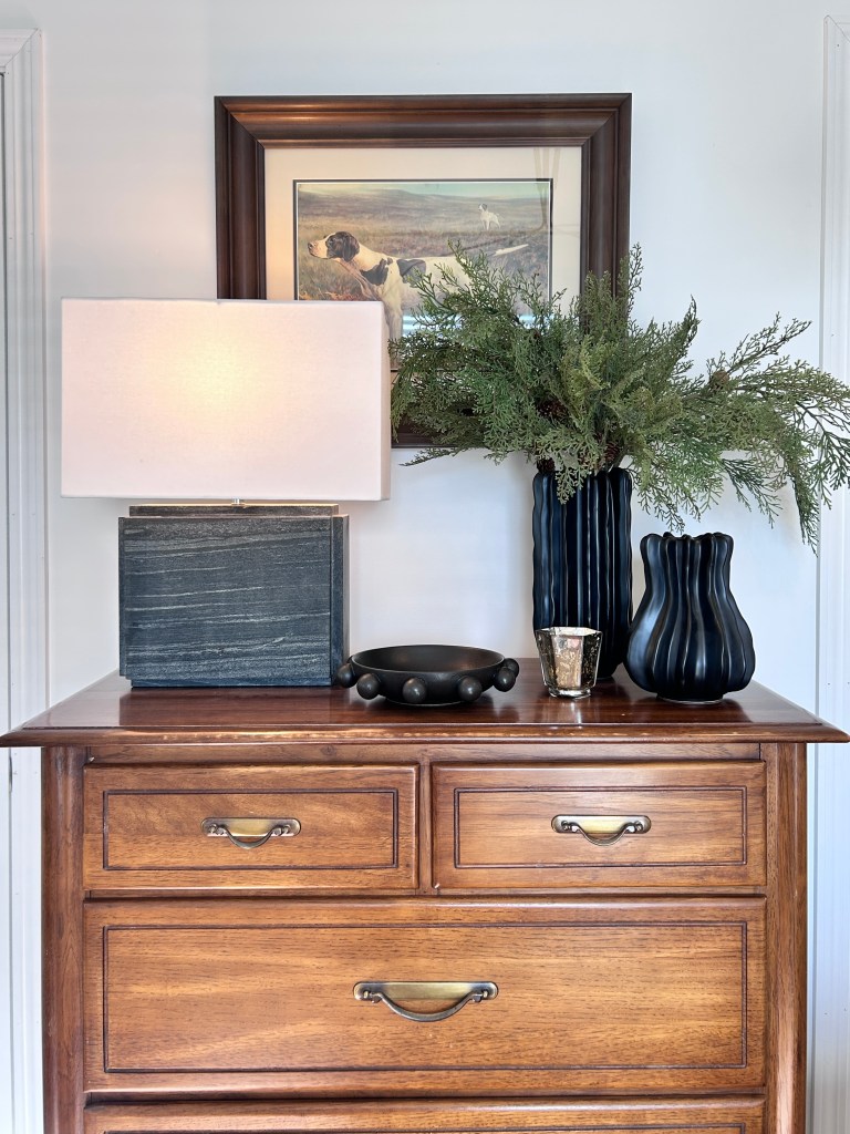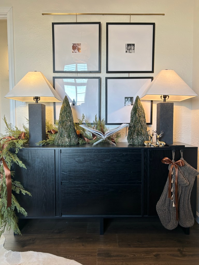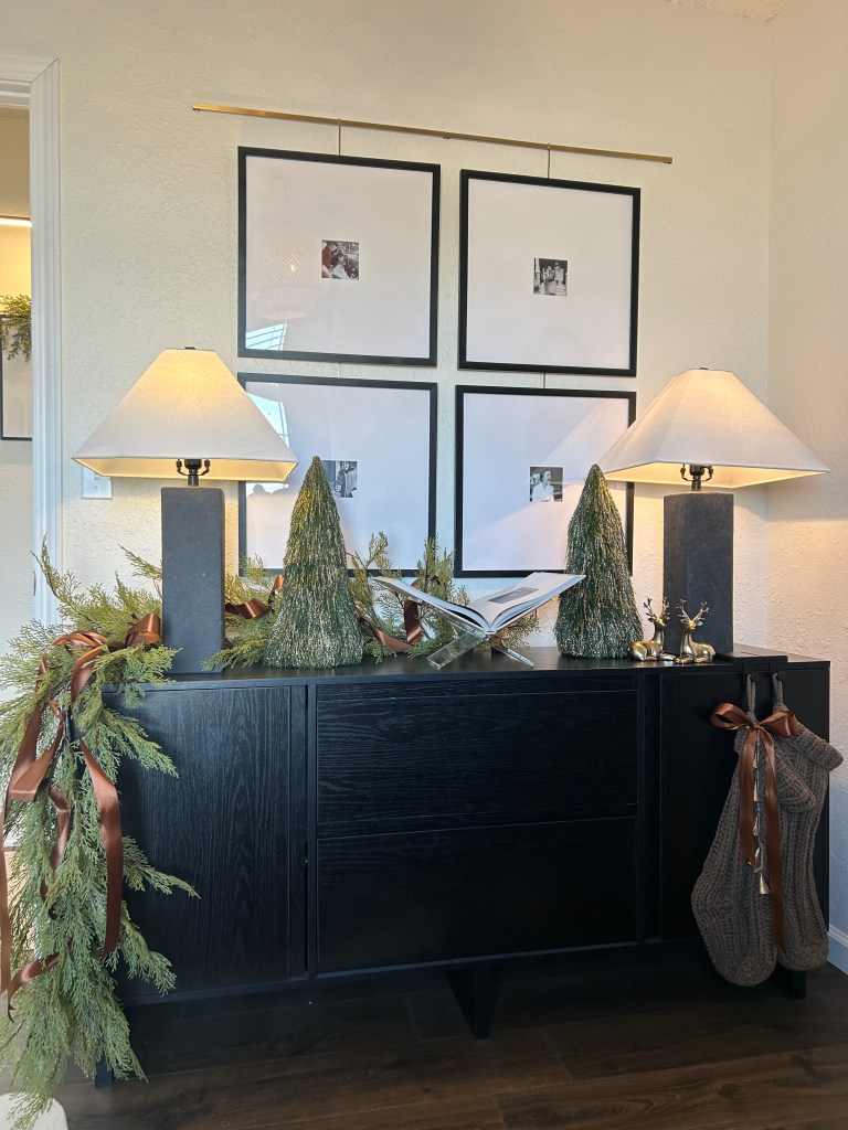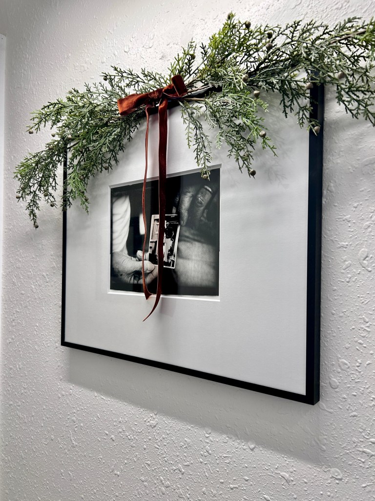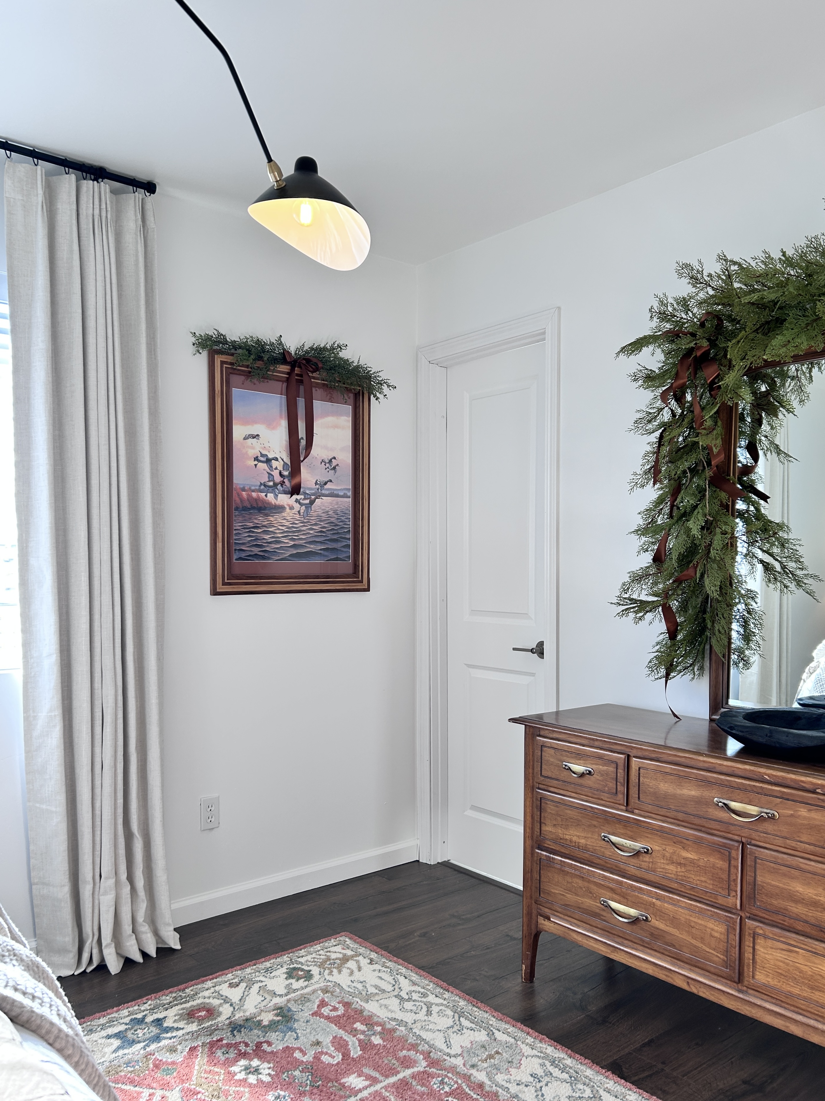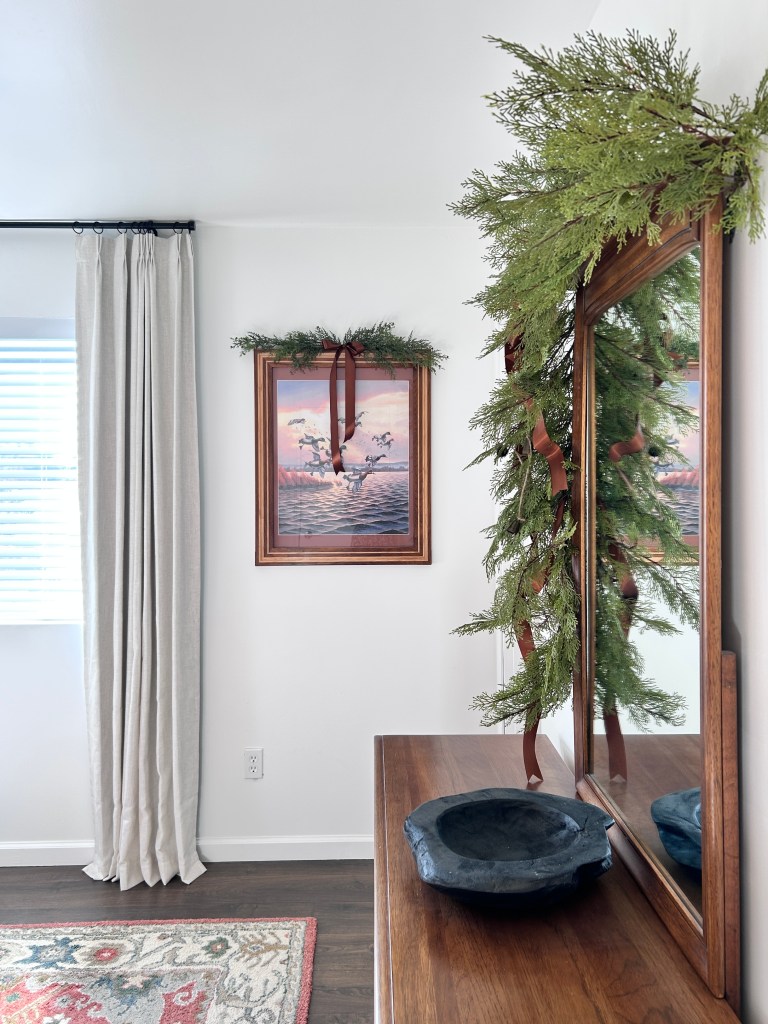 I have never decorated the bedrooms before but I had enough garland, ribbon, and greenery to branch out. Honestly, a little greenery and ribbon really gets the job done. No need for a ton of figurines or extra decor.